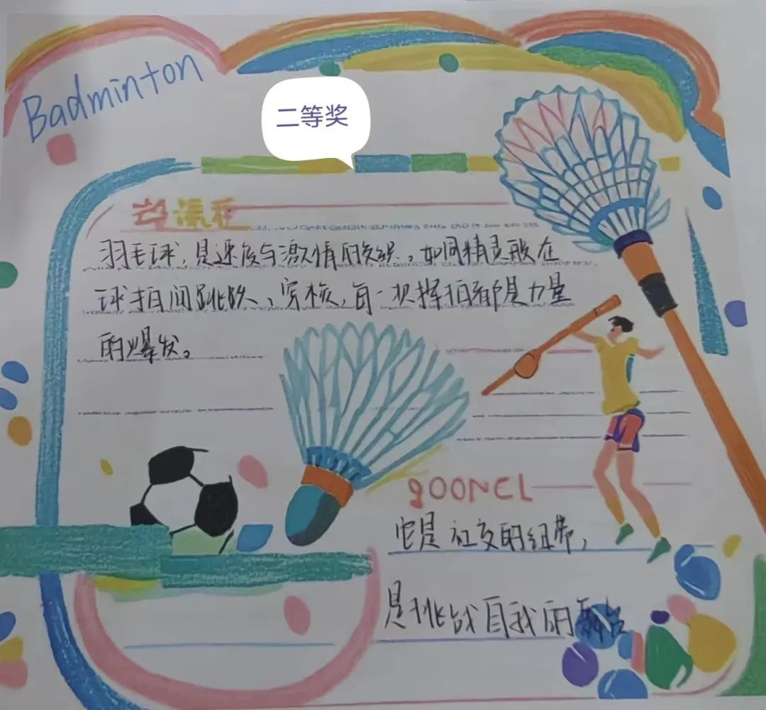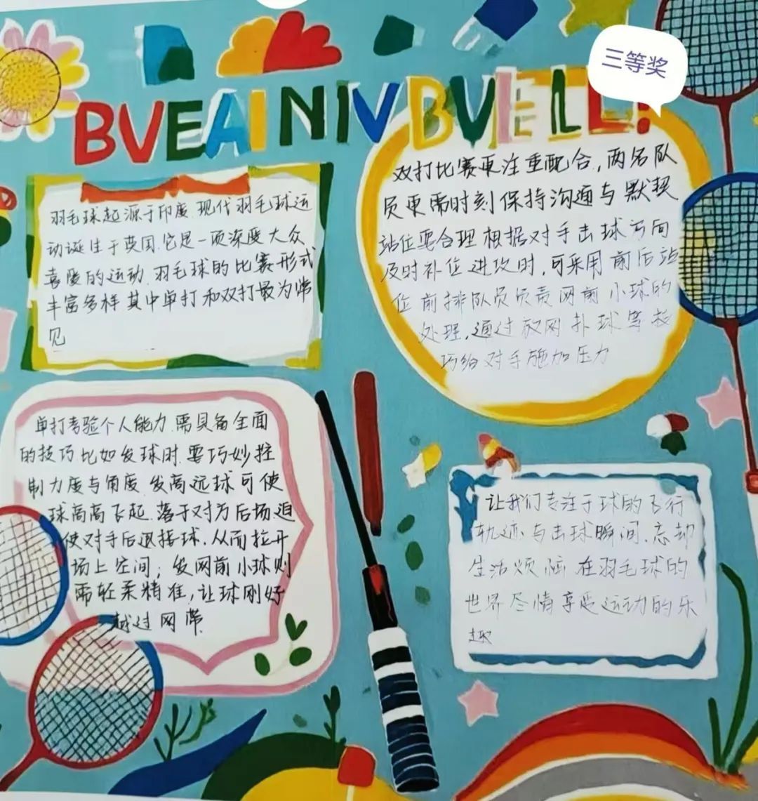 本次活动通过手抄报这一形式,鼓励同学们发挥自己的艺术才能,将羽毛球的魅力与运动精神通过绘画和文字的方式展示出来,既能提高大家的审美能力,又能增进对羽毛球运动的理解和热爱。今后羽毛球社将继续举办更多类似的活动,鼓励同学们以更加积极的态度面对学习与生活,发挥自己的特长,展现青春活力。