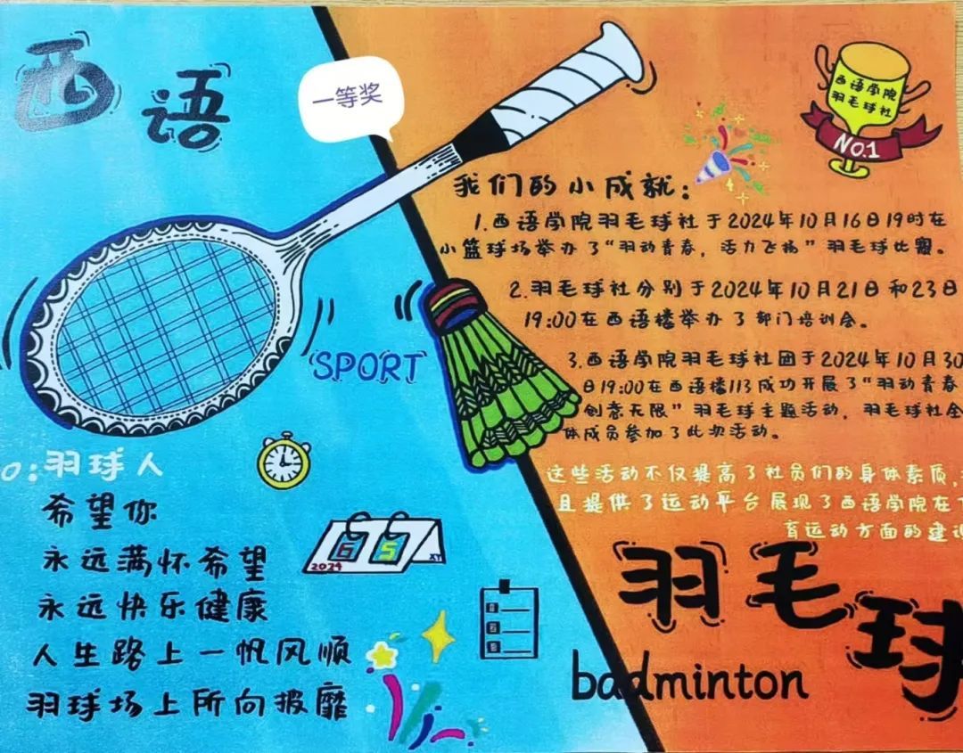 为丰富校园文化生活,展现同学们的活力与创造力,激发同学们的运动兴趣,同时提升同学们的创意表达和动手能力,西语学院羽毛球社成功开展“羽毛球展活力,手抄报绘风采”主题活动。