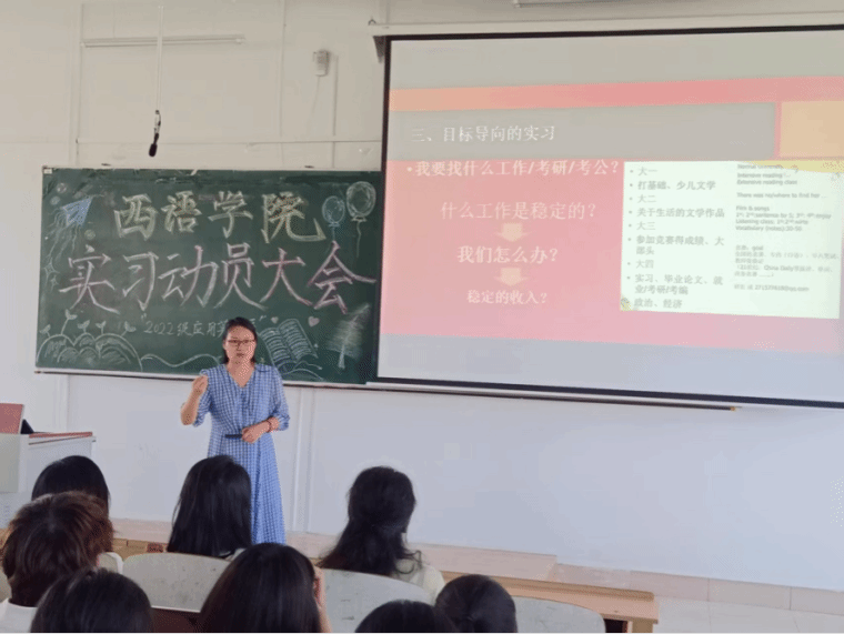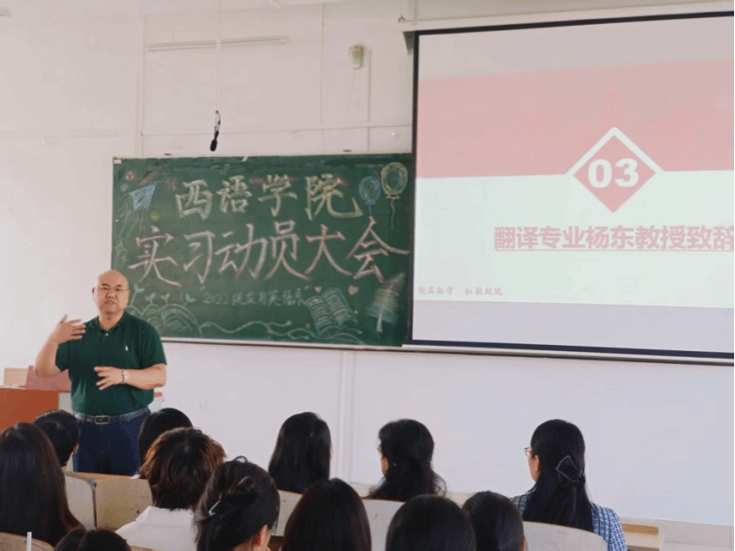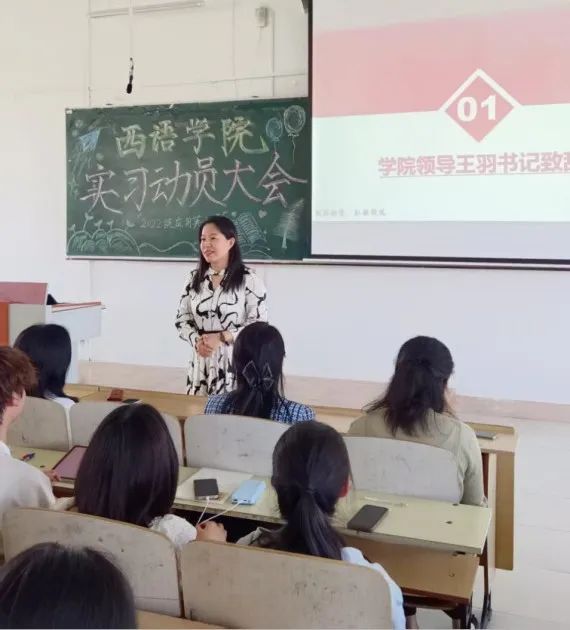 2025年6月11日下午13:30,应用英语系在西语楼503教室召开2022级商务英语专业和翻译专业实习动员大会,大会由2022级翻译专业学生佟美琦主持。西语学院党委书记王羽、应用英语系副主任杨东、辅导员张雨石老师、应用英语系孟繁婷、刘洋、丁昳玲、王跃、胡晓华、吴妍婷、李智等带队教师及2022级应用英语系全体学生参加会议。