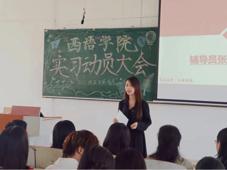实习动员大会第二项,由辅导员张雨石老师发言,她对同学们提出了四点要求:一是严守实习期间的纪律和规章制度,安全第一并保持信息畅通;二是调整心态,积极适应,完成学生到职场人的身份转变;三是虚心学习,提升能力,理论结合实践,定期反思总结;四是展现风貌,维护形象,注意言行举止,展现西语学子良好精神风貌。最后祝愿大家实习顺利,学有所成,圆满完成实习任务。