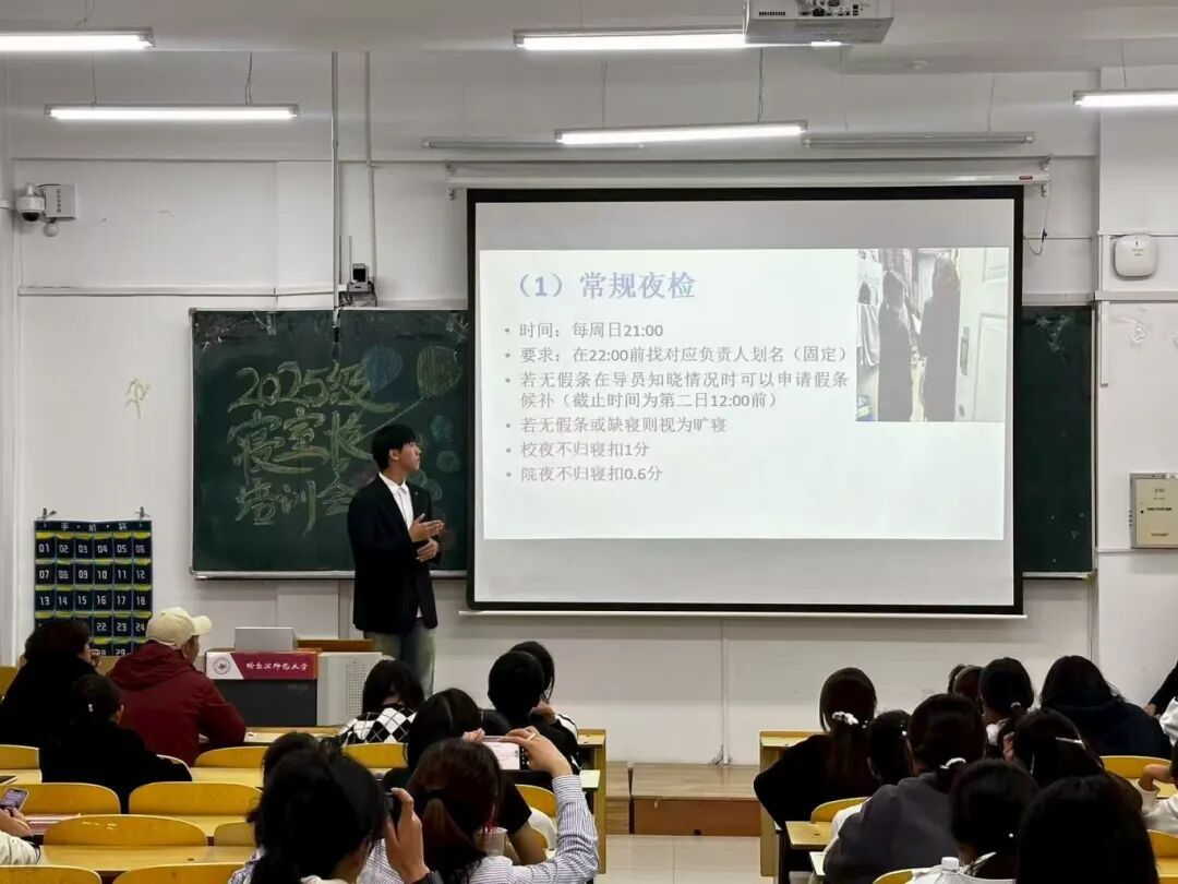 此外,纪检部重点围绕宿舍安全与秩序,为大家讲解了违规电器排查与禁烟工作,旨在守护学生生命财产安全与身心健康。同时,强化纪律教育,明晰校规校纪严肃性,并着力维护宿舍公共秩序,营造安全健康的住宿环境。