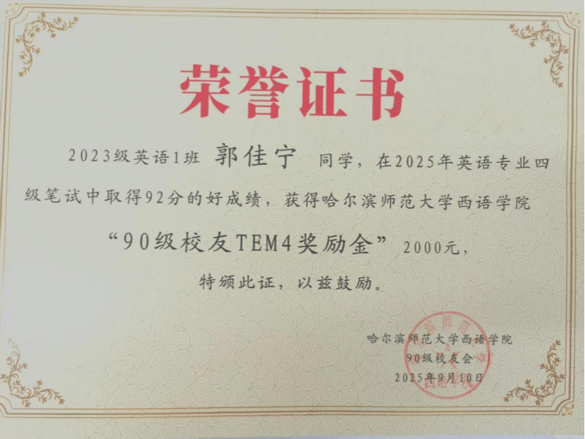 在2025年英语专业四级笔试中,2023级英语专业1班郭佳宁同学以92分的优秀成绩获得西语学院第一名,荣获 “90级校友TEM4奖励金”2000元。