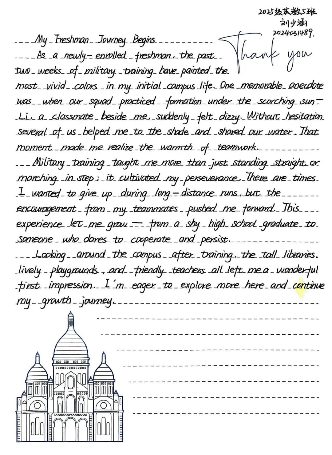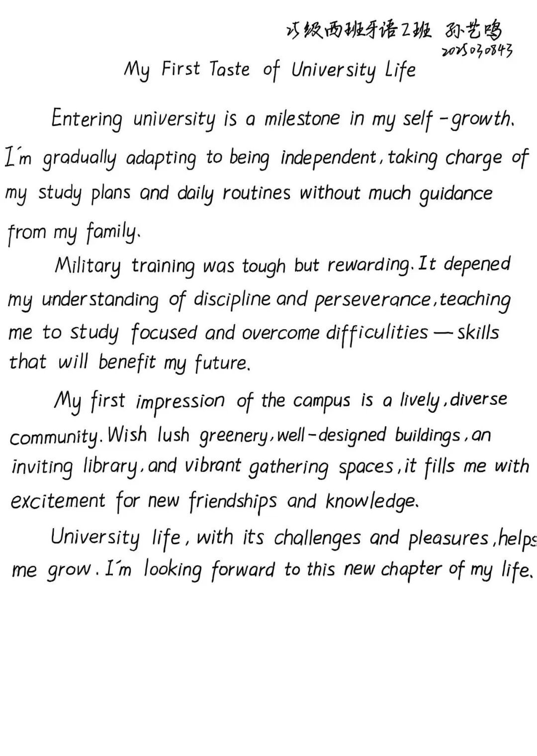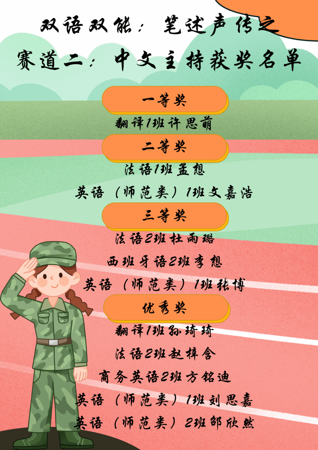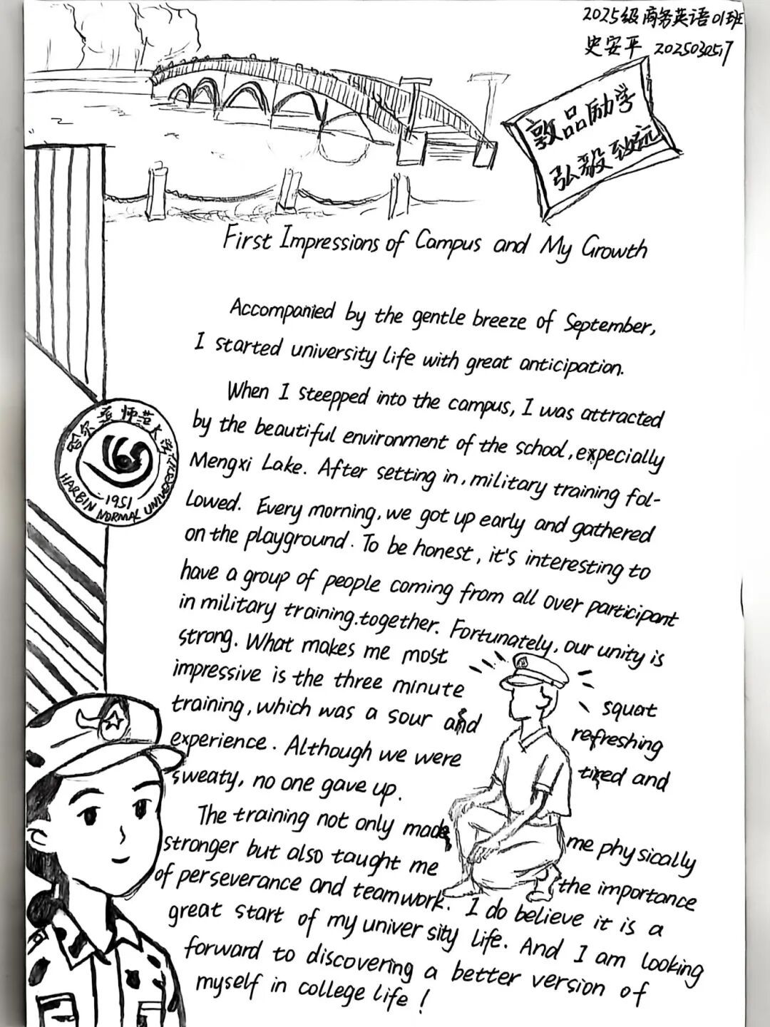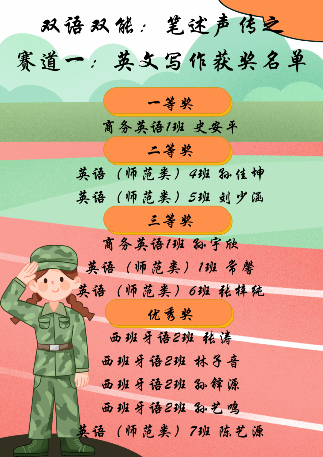 迷彩淬青春,笔声绽华光,且看西语学子以双语之能绘就军训盛景、以声文之美定格成长瞬间。为定格军训热血瞬间、镌刻大学初遇印象,西语学院学生会学习部于2025年9月9日重磅推出“双语双能 笔述声传”特色活动,至9月14日圆满收官。活动共收获180份饱含诚意的作品,经严谨评审,两大赛道分别诞生一等奖1名、二等奖2名、三等奖3名、优秀奖5名。