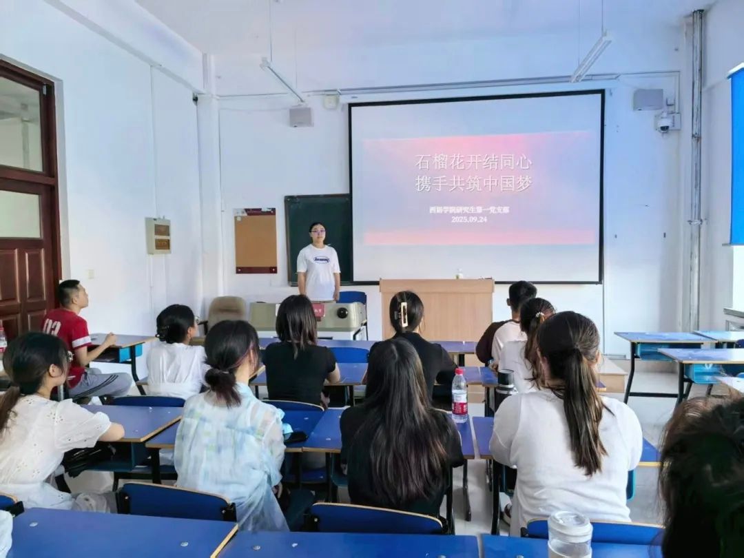 为深入贯彻落实中央民族工作会议精神,全面铸牢中华民族共同体意识,根据学校关于开展民族团结进步宣传月系列活动的统一部署,西语学院研究生第一党支部于2025年9月24日,在西语楼424成功举办了“石榴花开结同心、携手共筑中国梦”主题党日活动。支部全体党员参加了此次活动。本次主题党日活动旨在引导研究生党员深刻认识民族团结的极端重要性,增强维护国家统一和民族团结的自觉性、坚定性。活动内容充实,形式多样,取得了良好效果。
