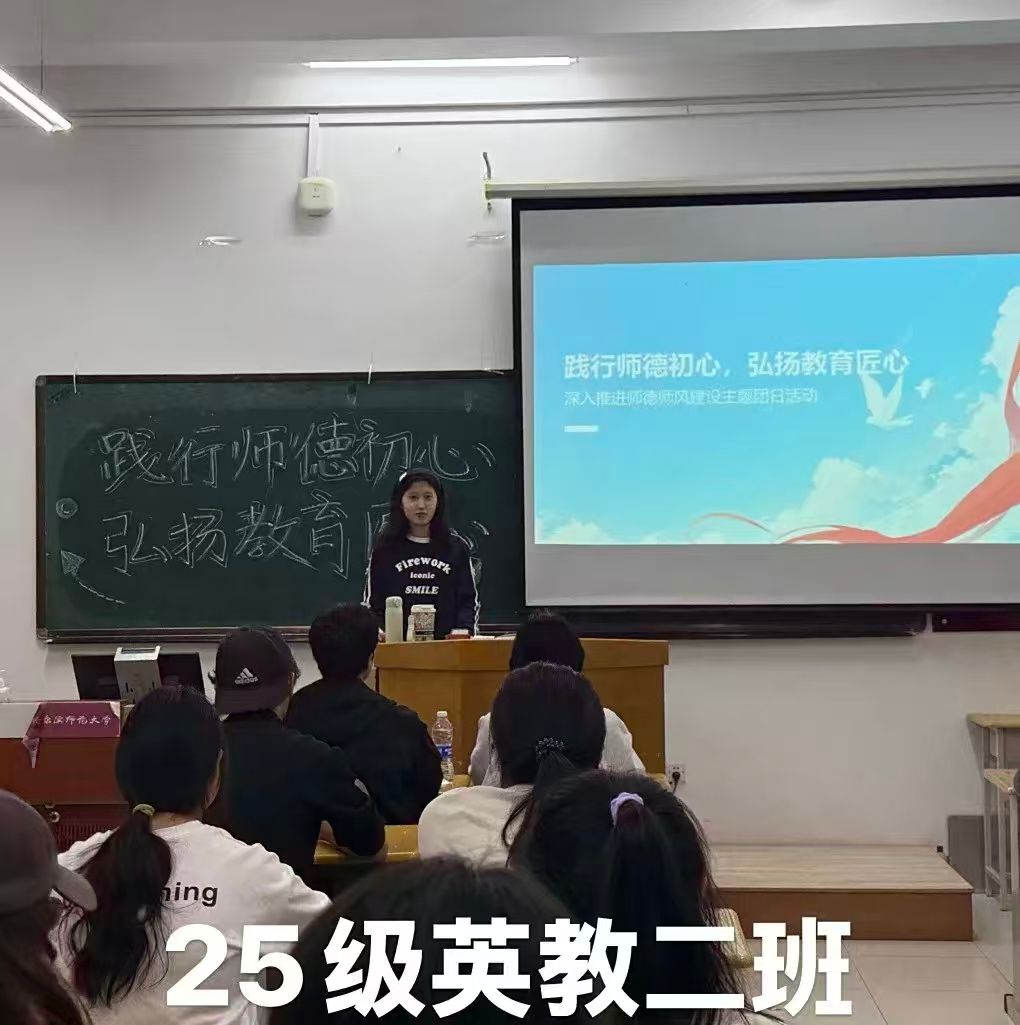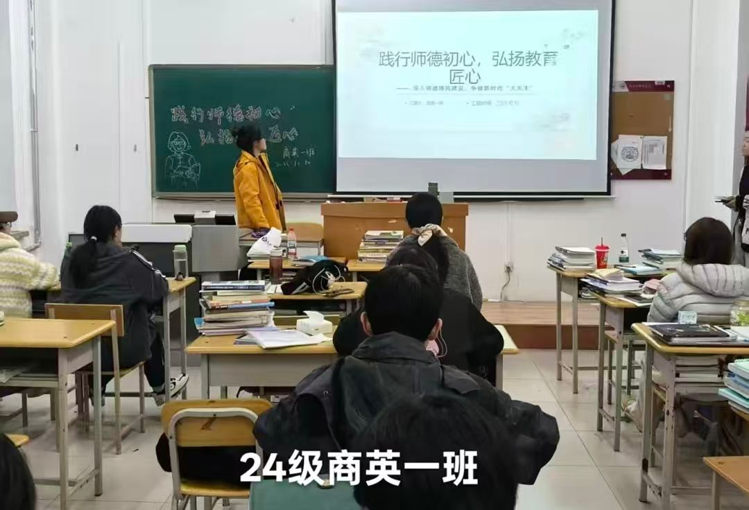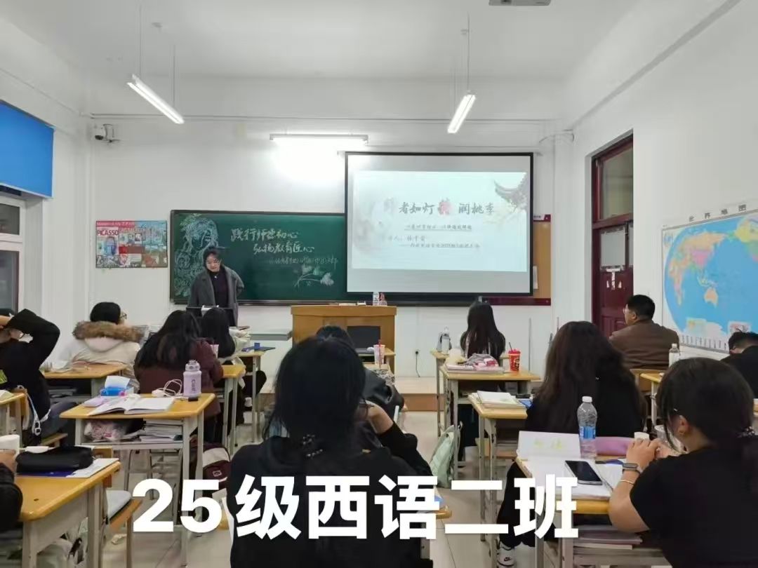 各团支部通过“师德故事分享会”“西语教师风采展”等形式,带领团员青年走近身边的师德榜样。从老一辈西语教师手写教材、深耕教学的坚守,到青年教师放弃假期指导学生竞赛、投身公益翻译的奉献;从课堂上逐字批改作文、纠正发音的细致,到课后组织“西语文化沙龙”、助力学生成长的用心,一个个真实案例、一段段温暖片段,让团员青年直观感受西语教师“以文化人、以语育人”的初心,深刻领悟“学高为师,身正为范”背后的责任与担当。