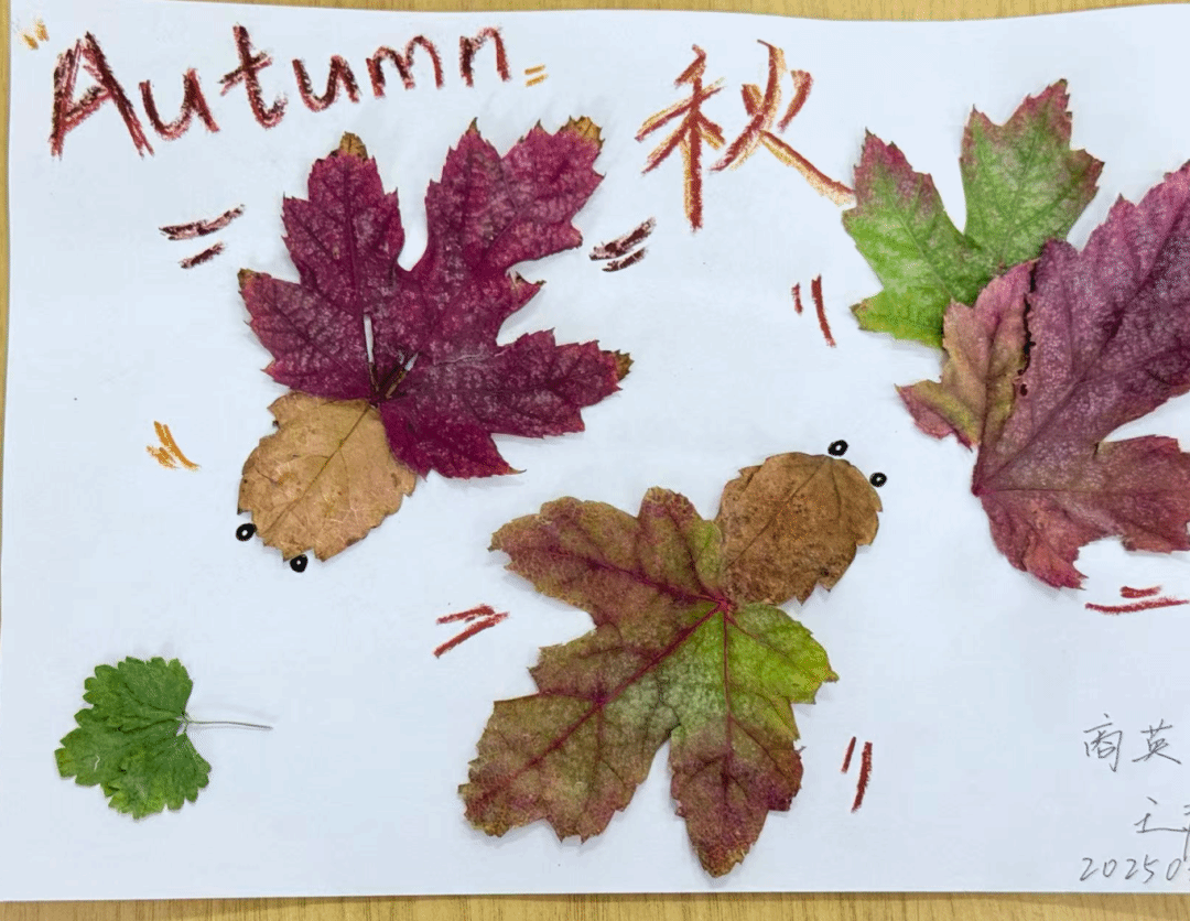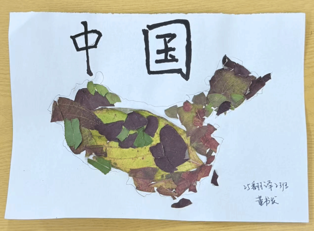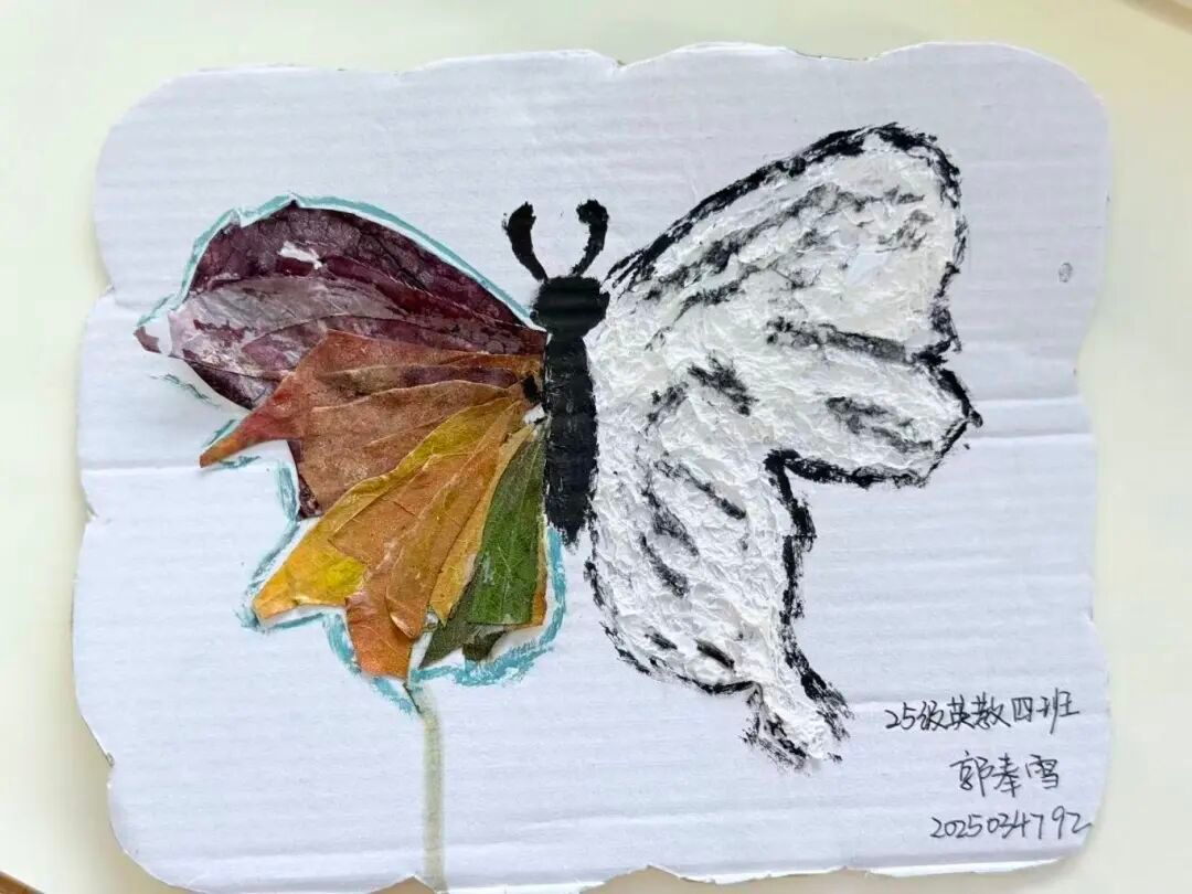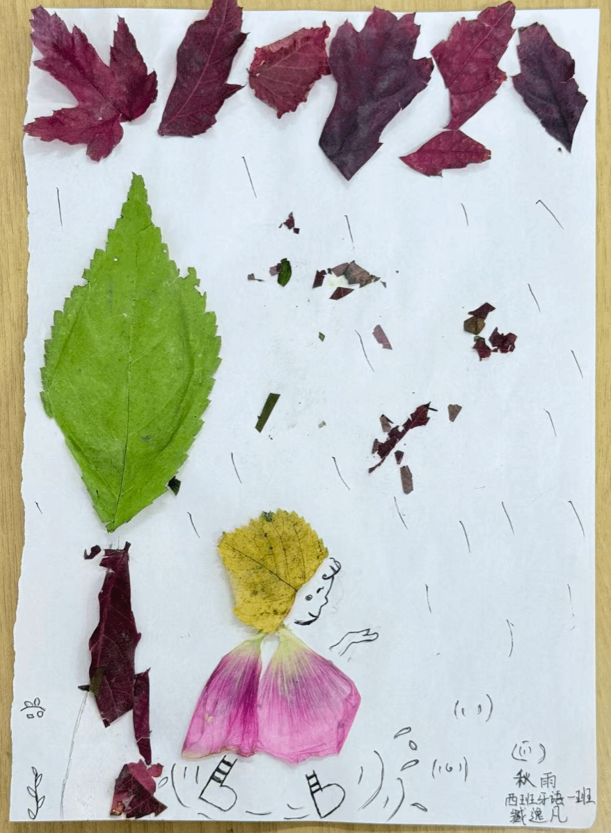 同学们的树叶贴画作品色彩丰富、创意十足,从秋日小熊、小王子形象,到旗袍、蝴蝶结造型,每件作品都巧妙运用不同形状与颜色的树叶,结合文字与线条,生动展现季节之美与艺术巧思,既体现了对自然材料的巧妙运用,也彰显了同学们的创造力与动手能力。