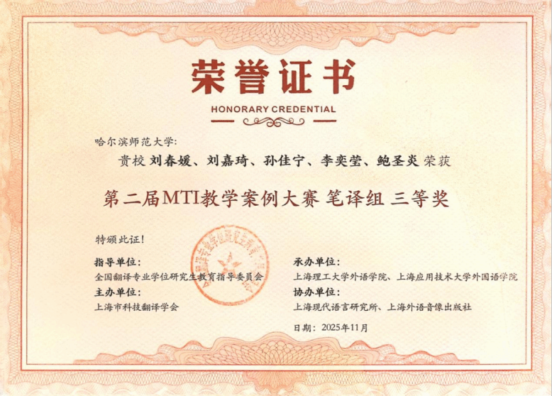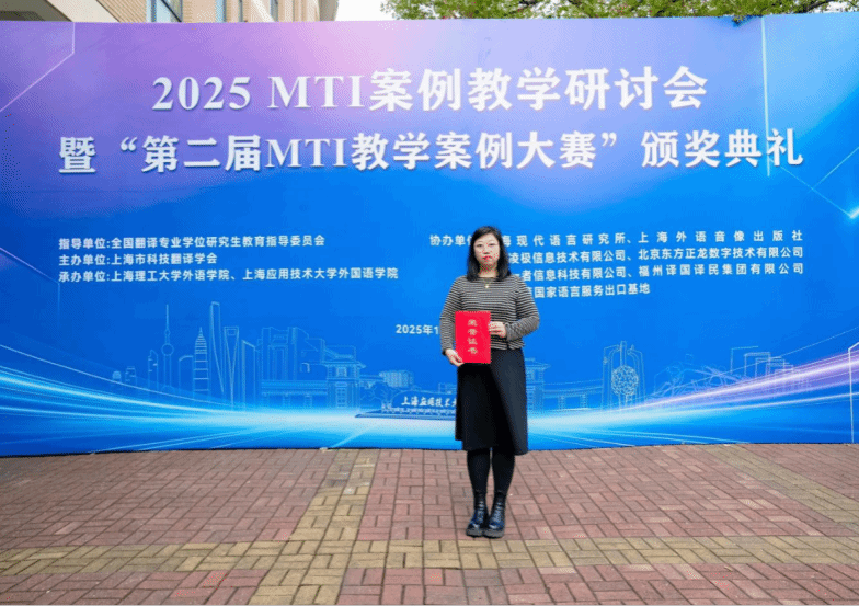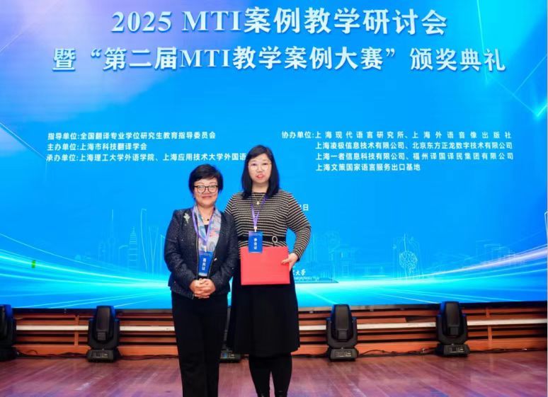 2025年11月1日,“第二届MTI教学案例大赛”颁奖典礼在上海应用技术大学隆重举行,西语学院教师刘春媛带领研究生刘嘉琦、孙佳宁、李奕莹、鲍圣炎等撰写的《美学视阈下方正剪纸术语的外宣翻译教学案例》经过多轮选拔,荣获笔译组三等奖。