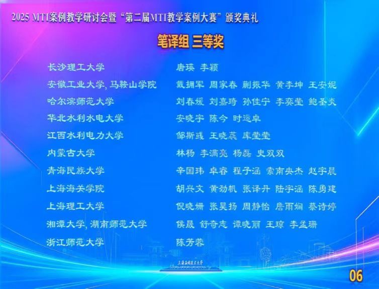 此次佳绩的取得,是我院坚持“以赛促教、以赛促学”理念取得的扎实成果,充分印证了学院在提升MTI教育质量与创新能力方面的切实成效。通过参与高水平的教学竞赛,我院教师不仅展示了风采,更在与同行的交流中汲取了宝贵经验。这一荣誉,为持续深化翻译人才培养模式改革注入了动力,也标志着在培养高素质、应用型翻译人才的道路上又迈出了坚实一步。未来,将继续深化案例教学研究与推广,将大赛成果反哺于日常教学,不断提升MTI人才培养质量,培养契合新时代需求的高层次、应用型、专业化翻译人才。
