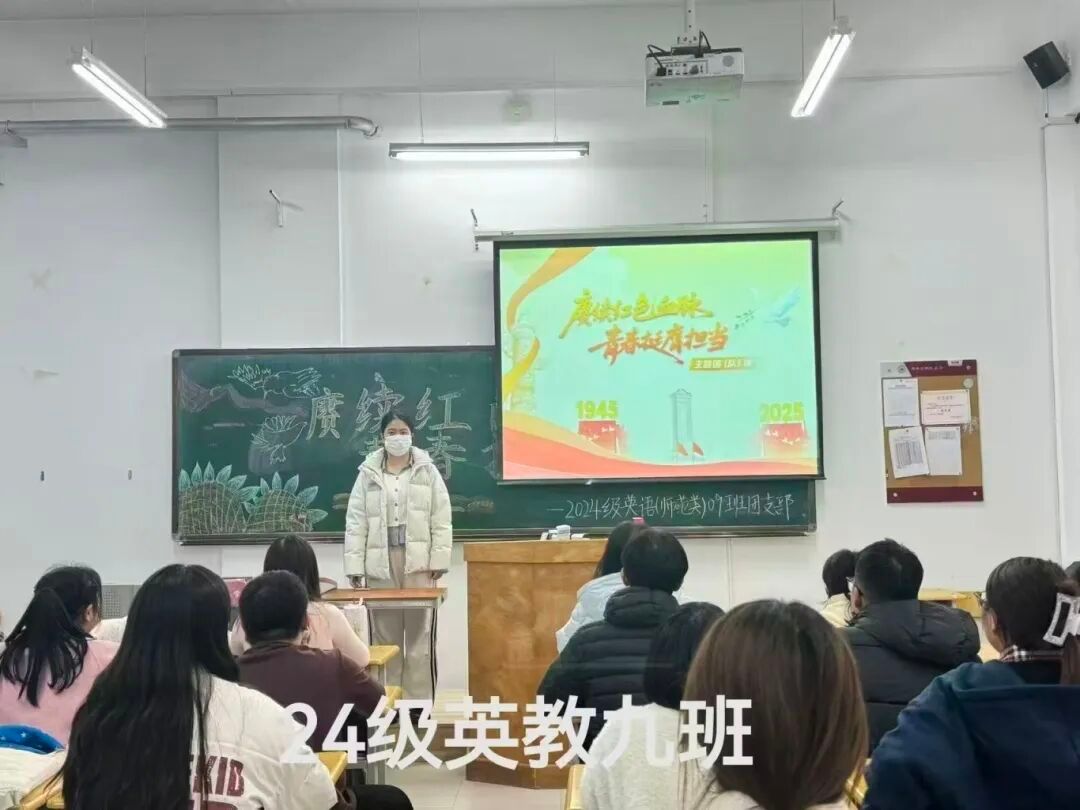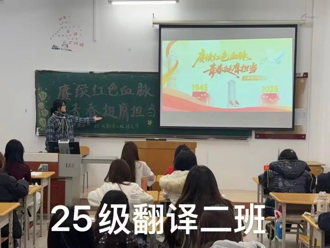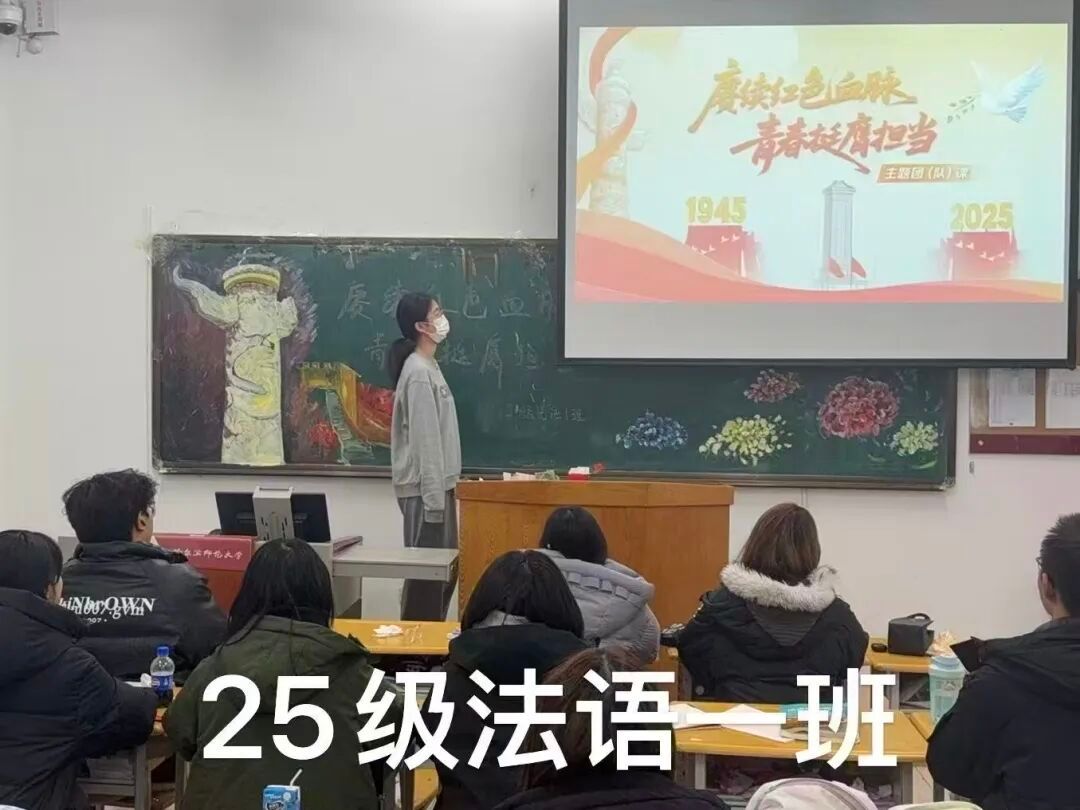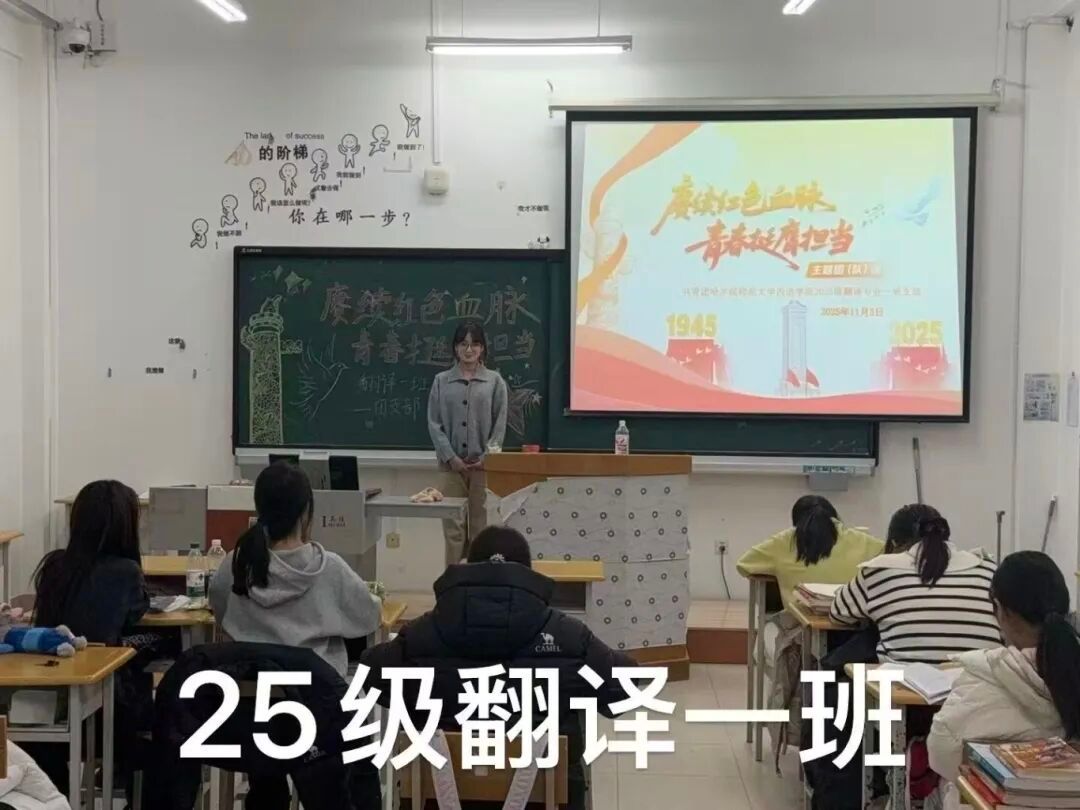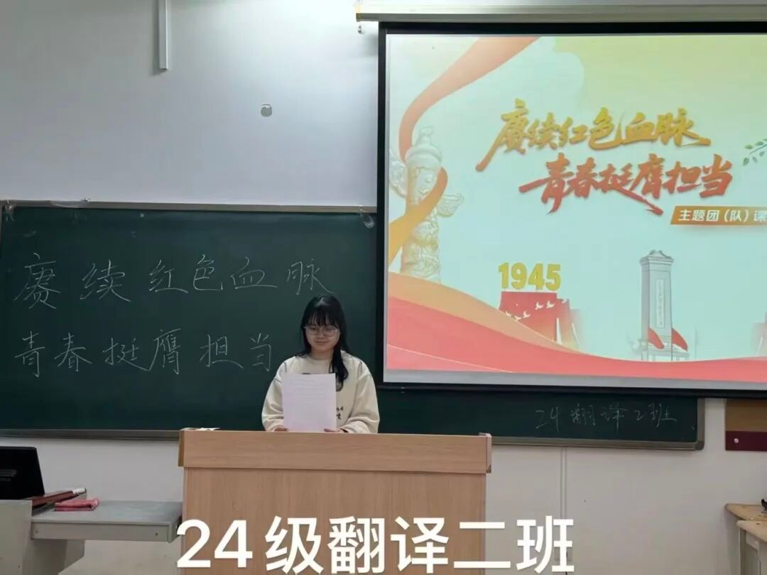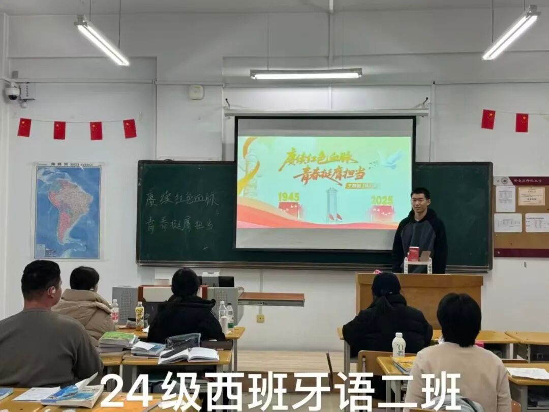 为深入学习宣传贯彻习近平总书记在纪念中国人民抗日战争暨世界反法西斯战争胜利80周年大会上的重要讲话精神,引导广大团员青年传承和弘扬伟大抗战精神,西语学院各团支部于2025年11月3日开展“赓续红色血脉,青春挺膺担当”主题团日活动。各团支部以多元形式挖掘和感悟精神内涵,确保学习教育走深走实,推动团员青年在感悟和思考中夯实成长根基,坚定历史自信。