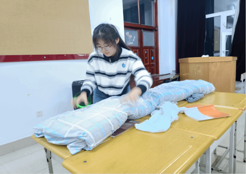 比赛进入第一环节——挑战赛“内务闯关”。八位选手通过线上抽签分组定序,在两分半钟的限时考验中,以床铺“标准”、衣物“整理”、桌面“收纳”三大关卡为载体,比拼的不仅是动手能力,更是条理性与协作力的综合较量。这不仅是对生活细节的极致打磨,更是对自律习惯与责任意识的生动践行,评委结合整洁度与用时的综合评判,打分的背后,是对“方寸之间见素养,细微之处显担当”的青春态度的肯定与嘉奖。