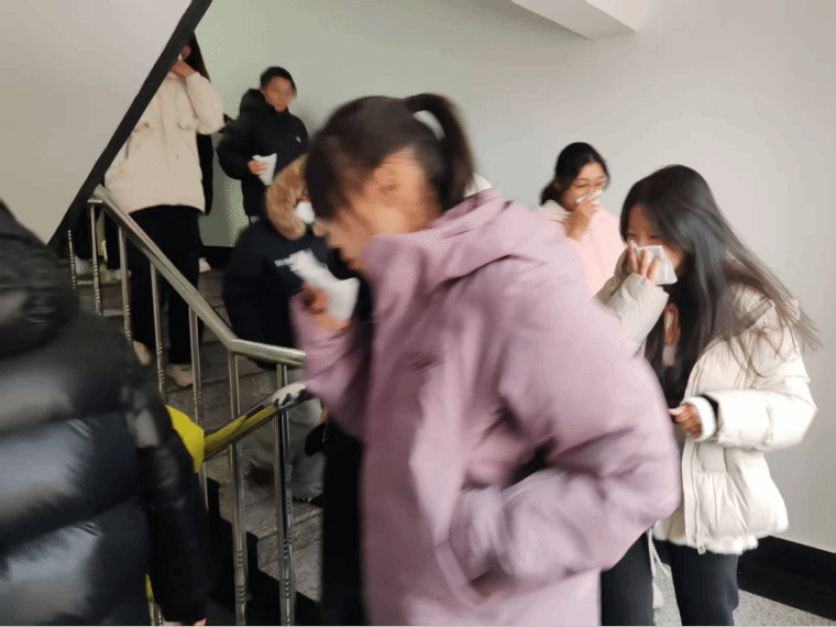 疏散演练开始后,同学们迅速以湿毛巾捂口鼻、低姿行进,沿楼梯两侧有序疏散,全程无拥挤、无慌乱,快速完成安全集结。这一高效有序的过程,既检验了大家对逃生规范的掌握程度,更让“安全秩序”转化为实际行动;既锤炼了紧急状态下的心理素质,也让默契配合成为安全保障的“隐形纽带”,真正把应急技能刻进了日常反应里。