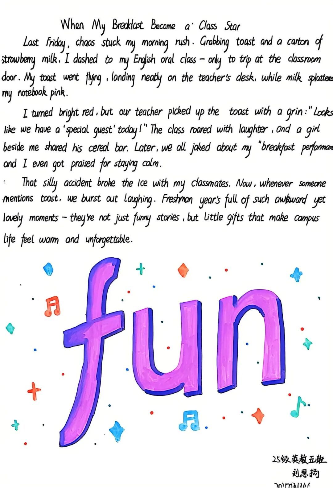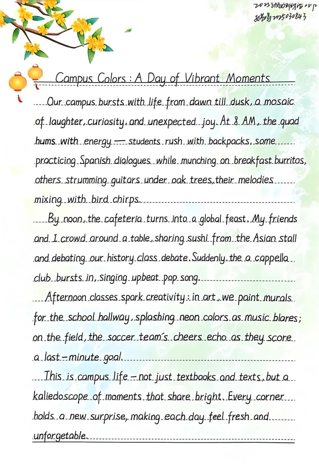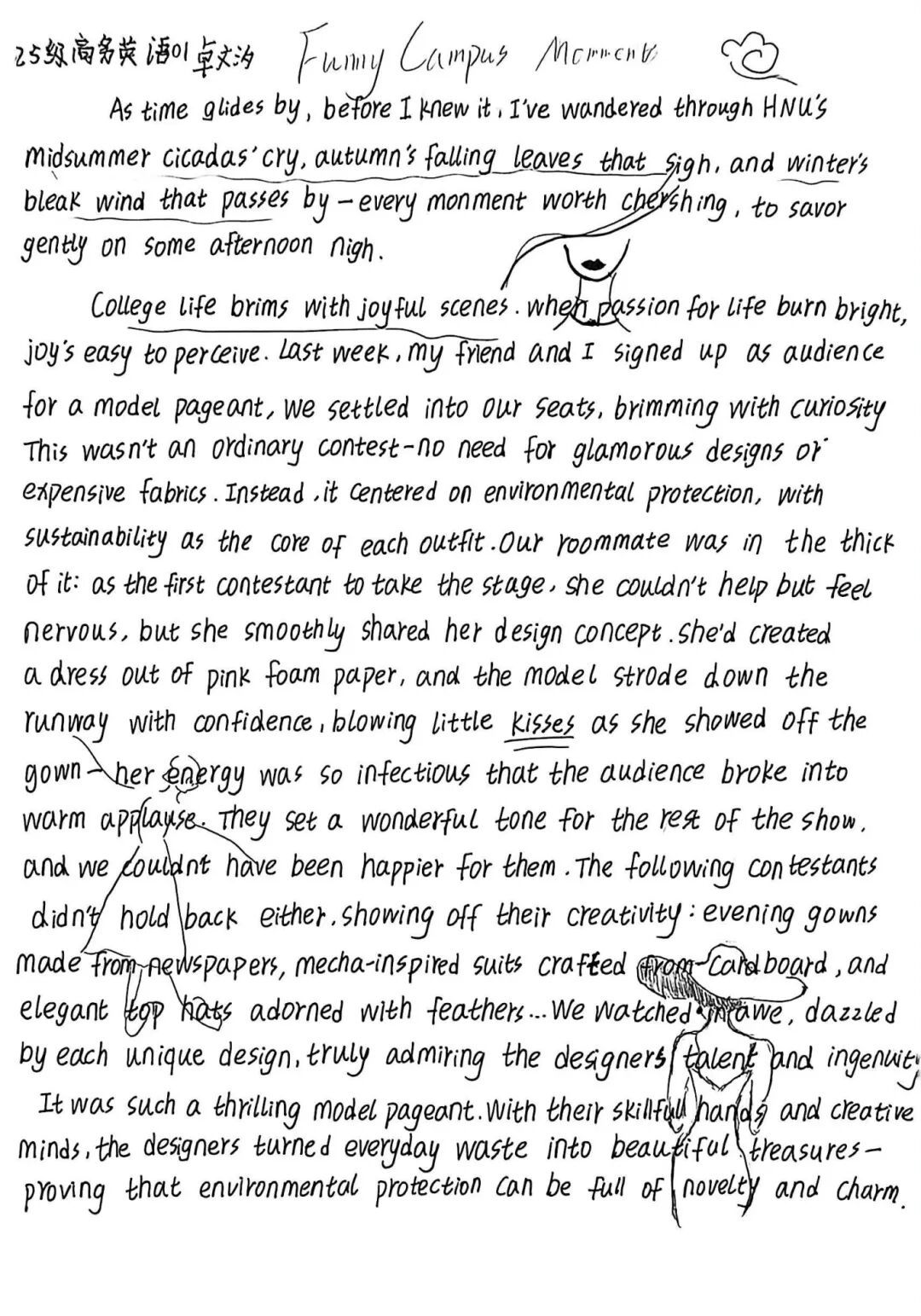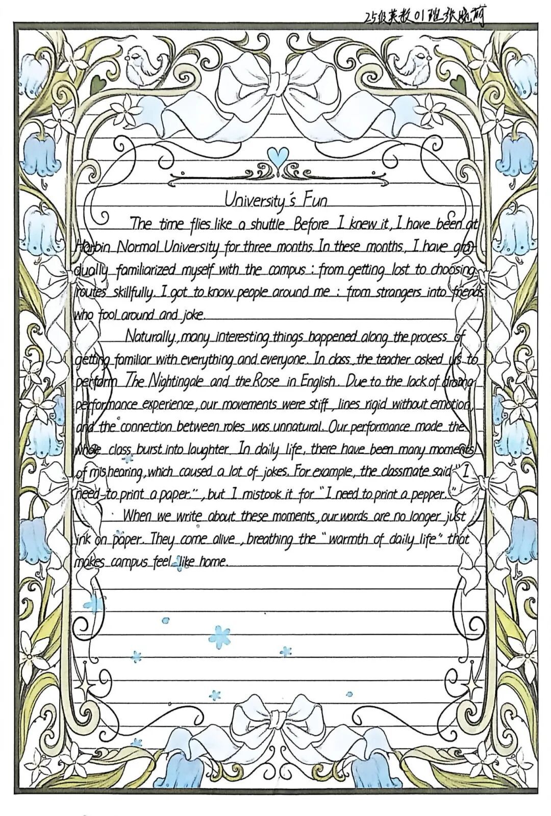 当笔尖与校园趣事相遇,当外文与生活温度碰撞,我们曾收到无数份满含创意的文字答卷——有人用英语记录食堂窗口的烟火气,有人以法语描绘课堂上的幽默瞬间,有人借西班牙语书写社团活动的热烈时光。这些文字,是对校园日常的细腻捕捉,更是对外文表达的浪漫诠释。