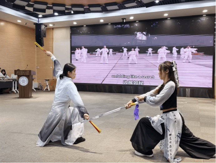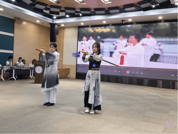在才艺展示部分,两位选手进行合作表演,太极扇与太极剑对打,剑走轻灵,扇藏巧变,陈久月同学持太极扇,赵霏璠同学持太极剑,身影交错,剑的锐烈与扇的圆融相生相克,攻防转换间既含太极“以柔克刚”的东方哲思,又藏“刚柔相济”的巧妙智慧,衣袂翻飞与器械交鸣相和,与两位同学的英文解说的背景音交织,千年文明的东方沉淀与西方语言融合,焕发出西语学子的独特生机。台下评委老师和工作人员都献上了热烈的掌声。特别鸣谢才艺展示的动作指导,来自哈师大体育科学学院的付艳敏老师和武术与民族传统体育专业的蔡泽坤同学和马广麟同学,感谢老师和学生们为我院学子提供的专业指导,在此致以崇高敬意。