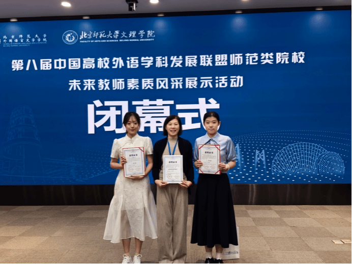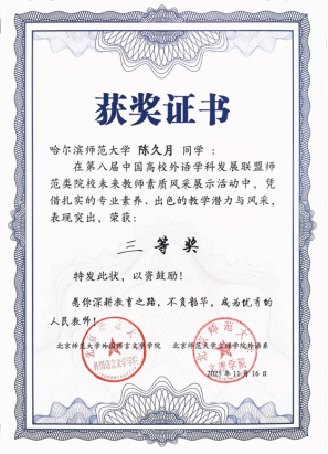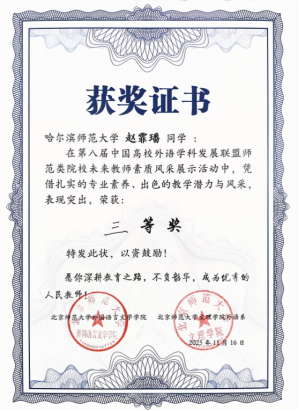 为全面提升师范类院校学生英语教学技能和教学水平,推动未来卓越英语教师综合素养的培养,发挥职前教师教育的引领示范作用,同时促进师范院校英语专业的交流,中国高校外语学科发展联盟师范类院校委员会主办,北京师范大学外国语言文学学院、北京师范大学文理学院外语系承办“第八届中国高校外语学科发展联盟师范类院校未来教师素质风采展示活动”,在北京师范大学珠海校区举办。比赛于2025年11月17日落幕。我院白丹和张瑞丹两位老师共同指导的23级学生赵霏璠同学、陈久月同学获得三等奖。