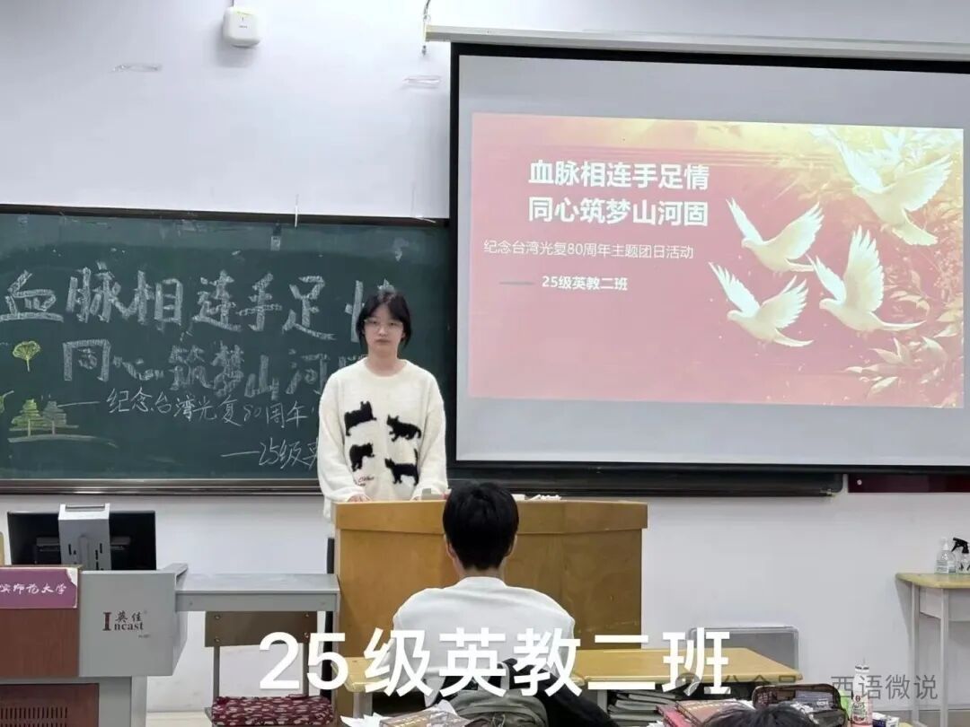各团支部组织团员观看《国土重光——纪念台湾光复80周年》《台湾·1945》等史料短片。观影过程中,同学们全神贯注,深刻体会两岸同胞血脉相连的深厚情谊。