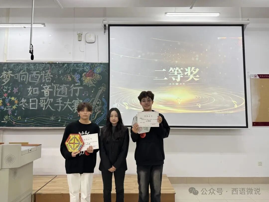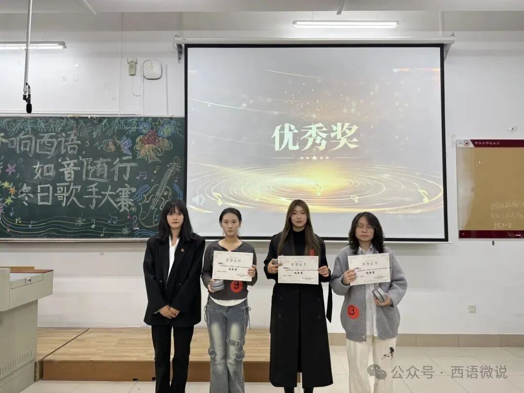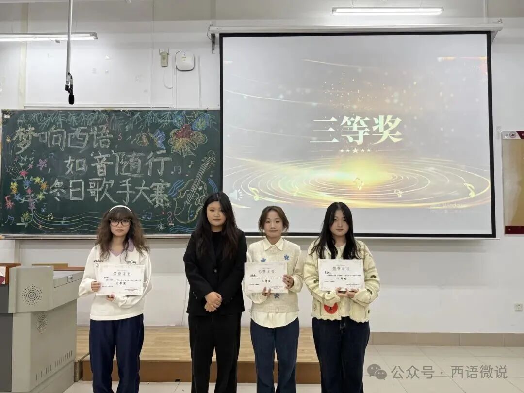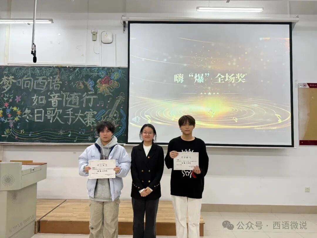 歌声会落幕,但热爱永不散场。旋律渐止,余音绕梁;赛事落幕,热忱未央。 随着各奖项的逐一揭晓,本届冬日歌手大赛在掌声与欢呼中画上圆满句号。这不仅是一场音乐的竞技,更是一次青春的欢聚。我们铭记每位选手舞台上的倾情绽放,感谢评委团的公正评审与专业指导,感激幕后工作人员的辛勤付出,也珍视每一位现场观众的热情陪伴。愿今夜的歌声成为所有人心中温暖的光, 照亮前路,鼓舞每一位西语学子在未来的旅程中继续勇敢追梦,让青春的光芒永远闪耀!