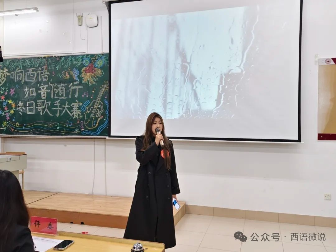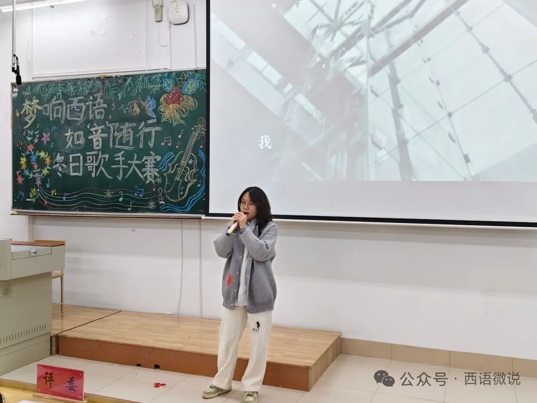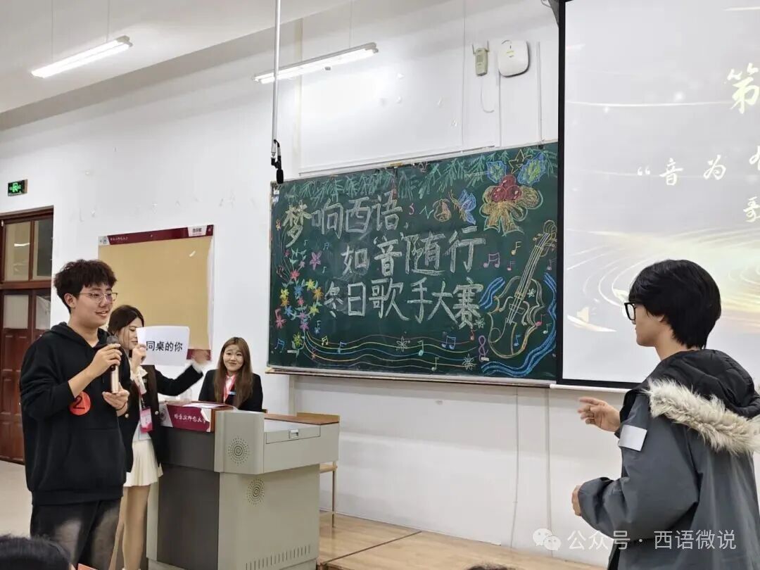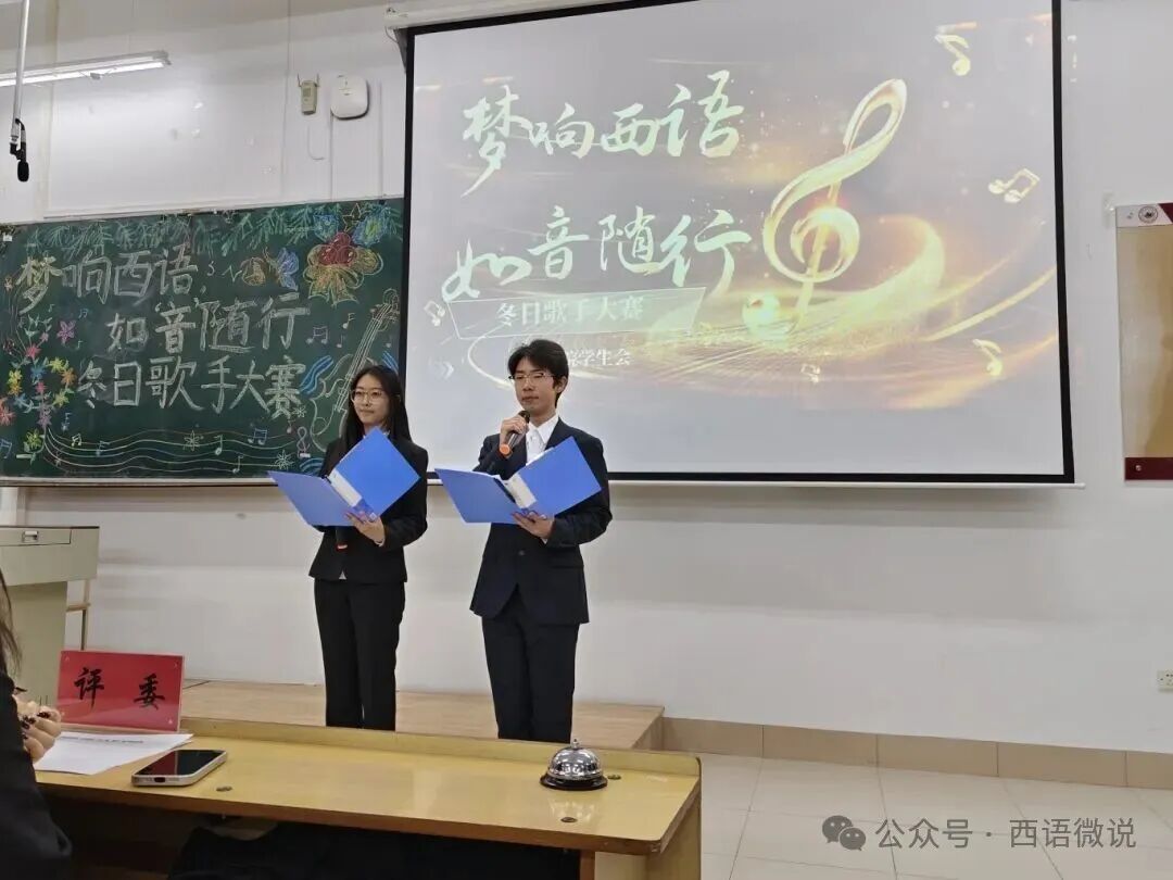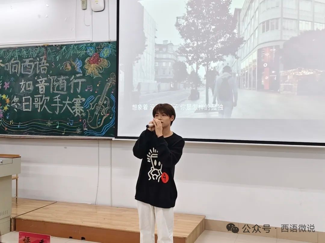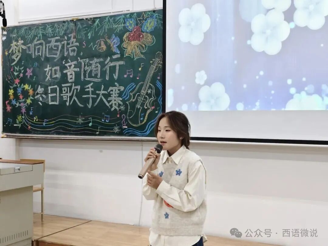 星光点亮冬夜,旋律温暖心房。 西语学院学生会于12月1日晚19:00举办了“梦响西语,如‘音’随行”冬日歌手大赛决赛。十位怀揣音乐梦想的西语学子,历经初赛选拔,终于站上了决赛的闪耀舞台。在主持人王柄淏、杨金凤热情洋溢的介绍下,一场关于热爱、青春与梦想的视听盛宴正式拉开帷幕。今夜,他们以歌为媒,用旋律诉说故事,用音符碰撞灵魂,共同谱写了一段难忘的冬日乐章。