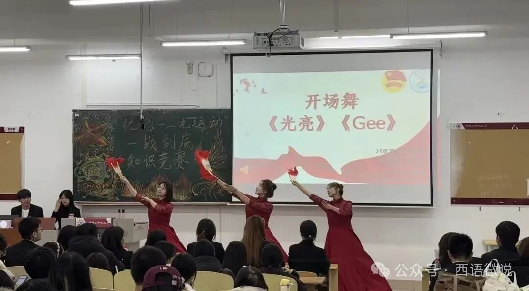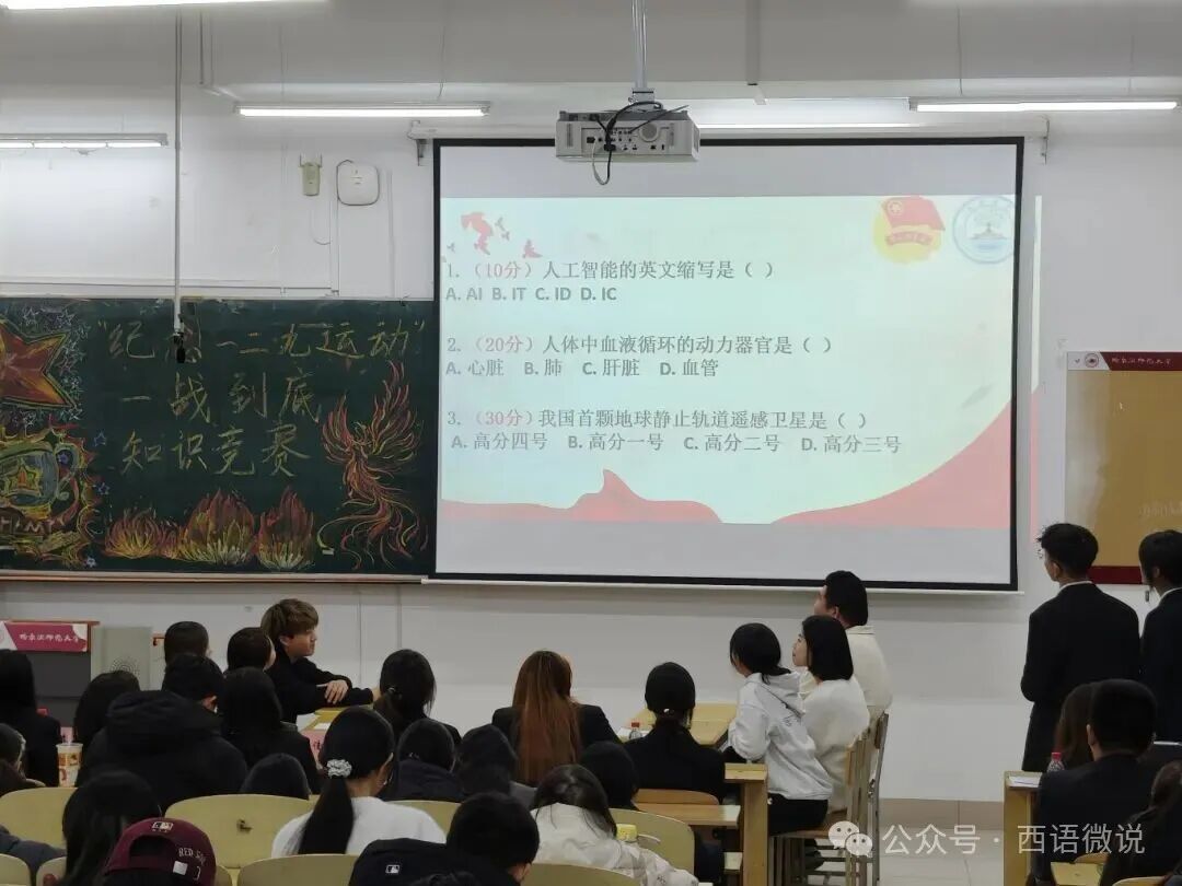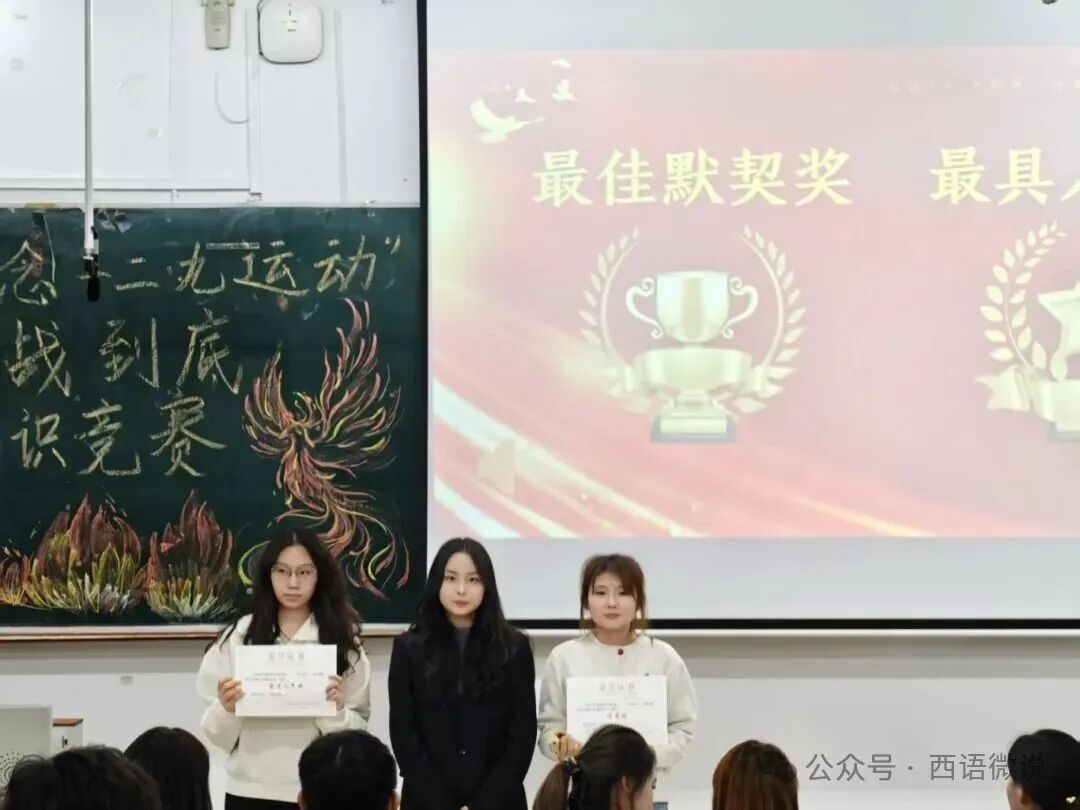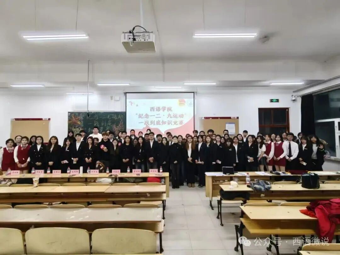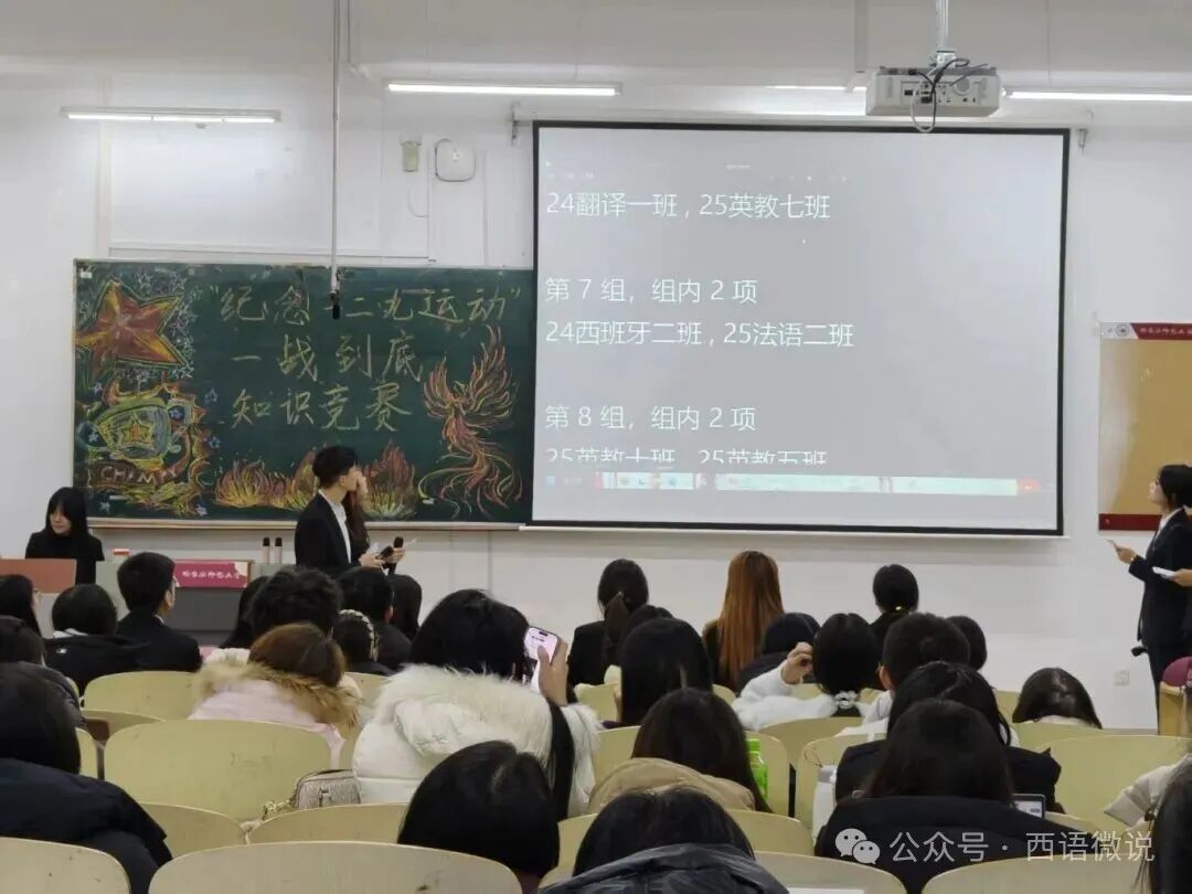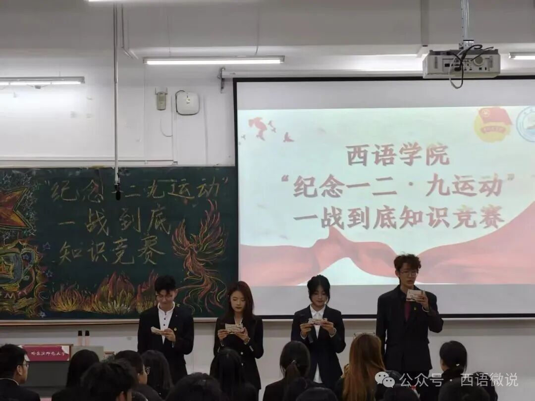 为纪念“一二·九”爱国运动,激发青年爱国热情,西语学院团委于2025年12月开展“一二·九”爱国运动知识竞赛。西语学院团委书记徐伟伟,校学生会主席团成员李思潼,校行知青年新媒体中心副主任项奎智,经济与管理学院团委学生兼职副书记李柯敏,东语学院团委学生兼职副书记韩溪娅,西语学院团委学生兼职副书记计美佳,曹妍妍,苏鑫蕊担任本次比赛评委。