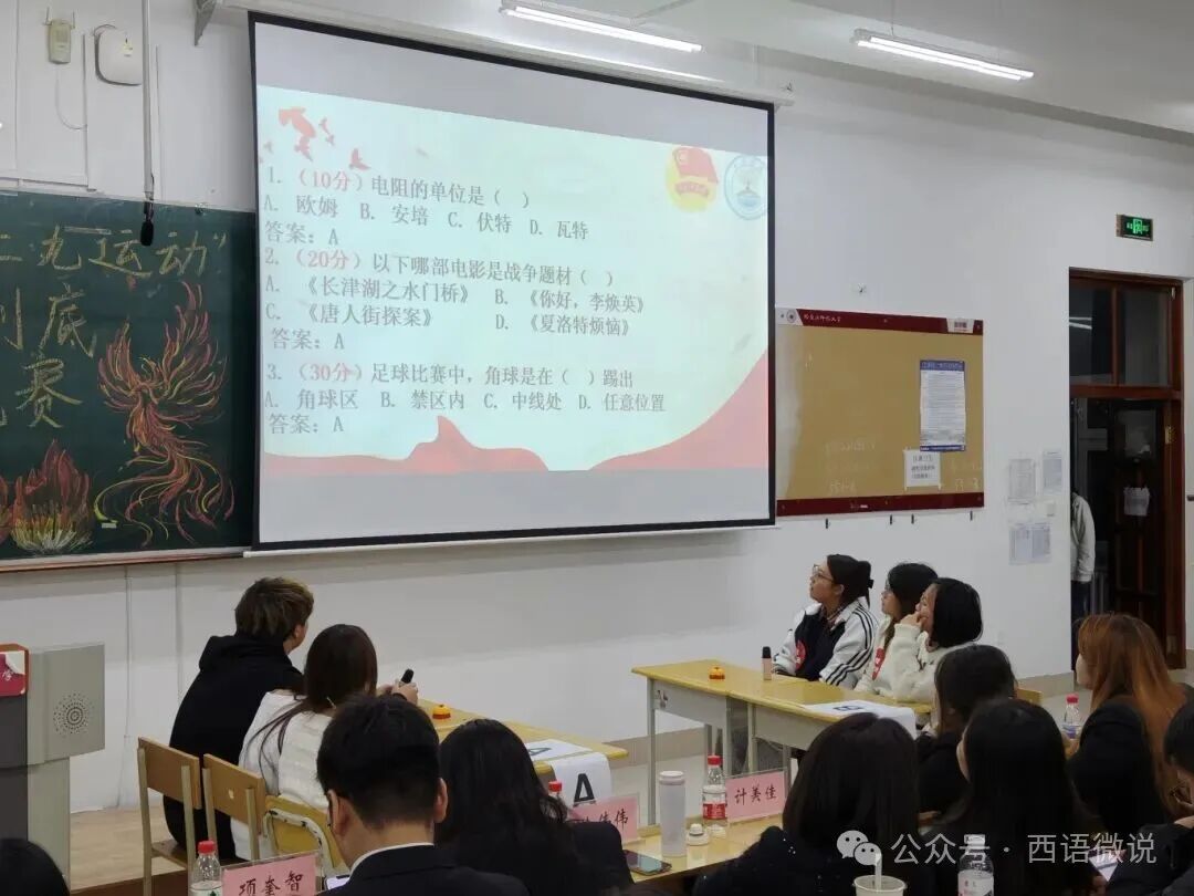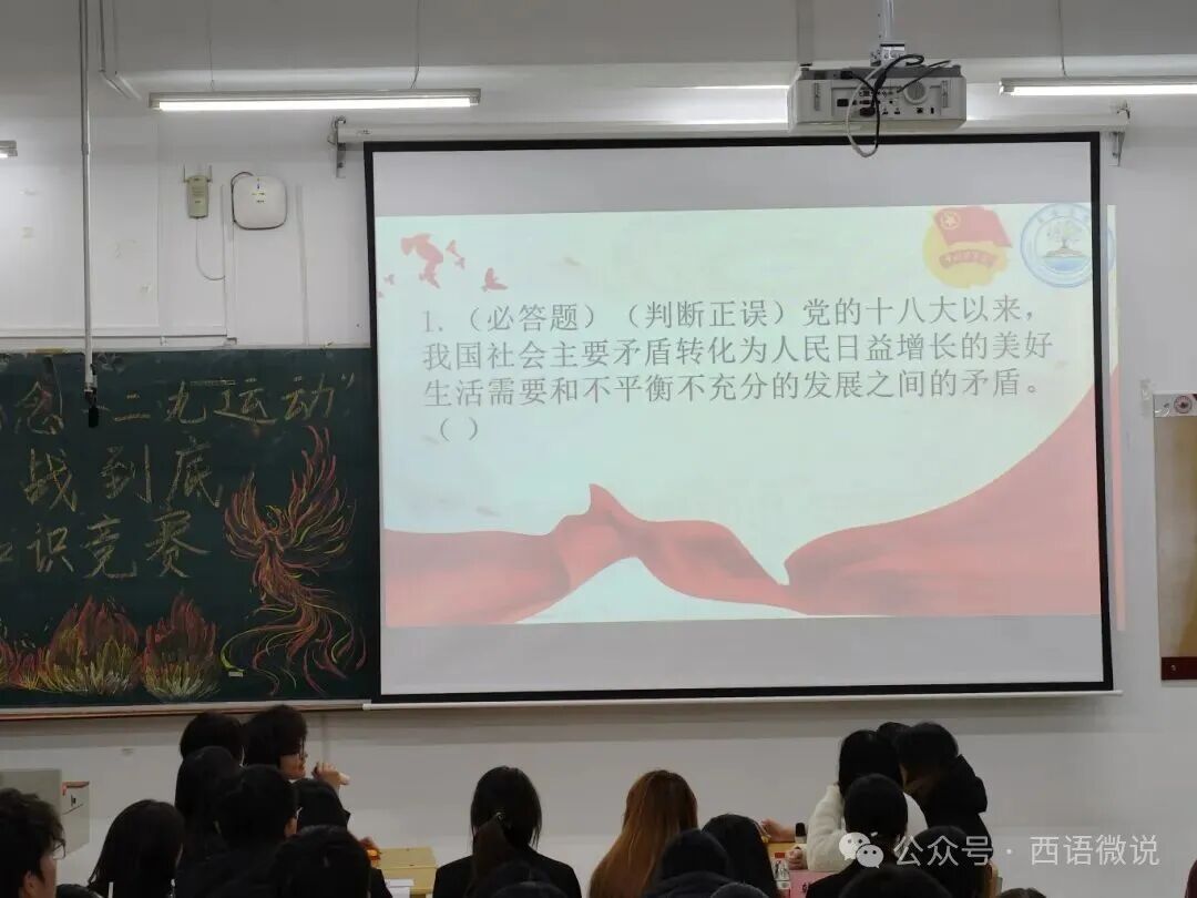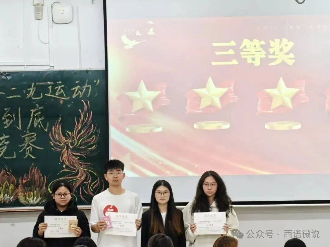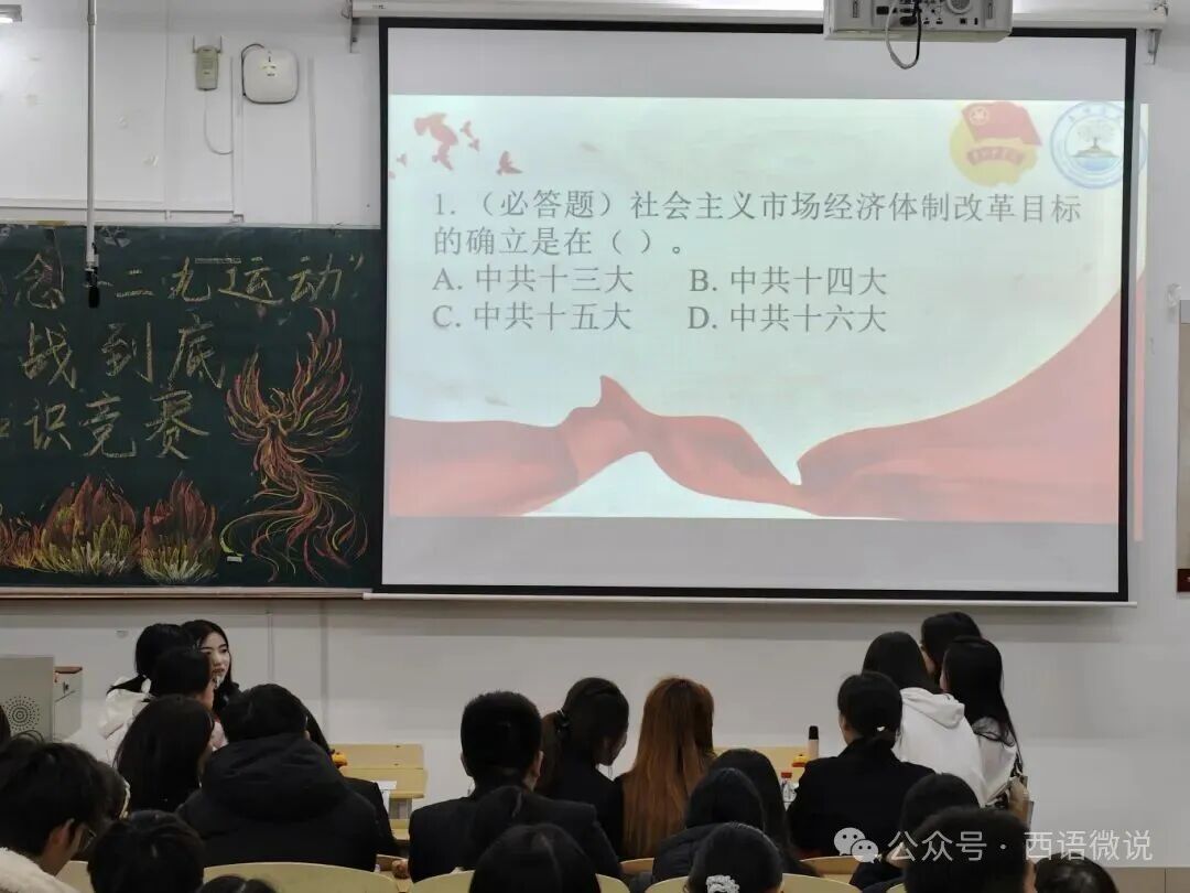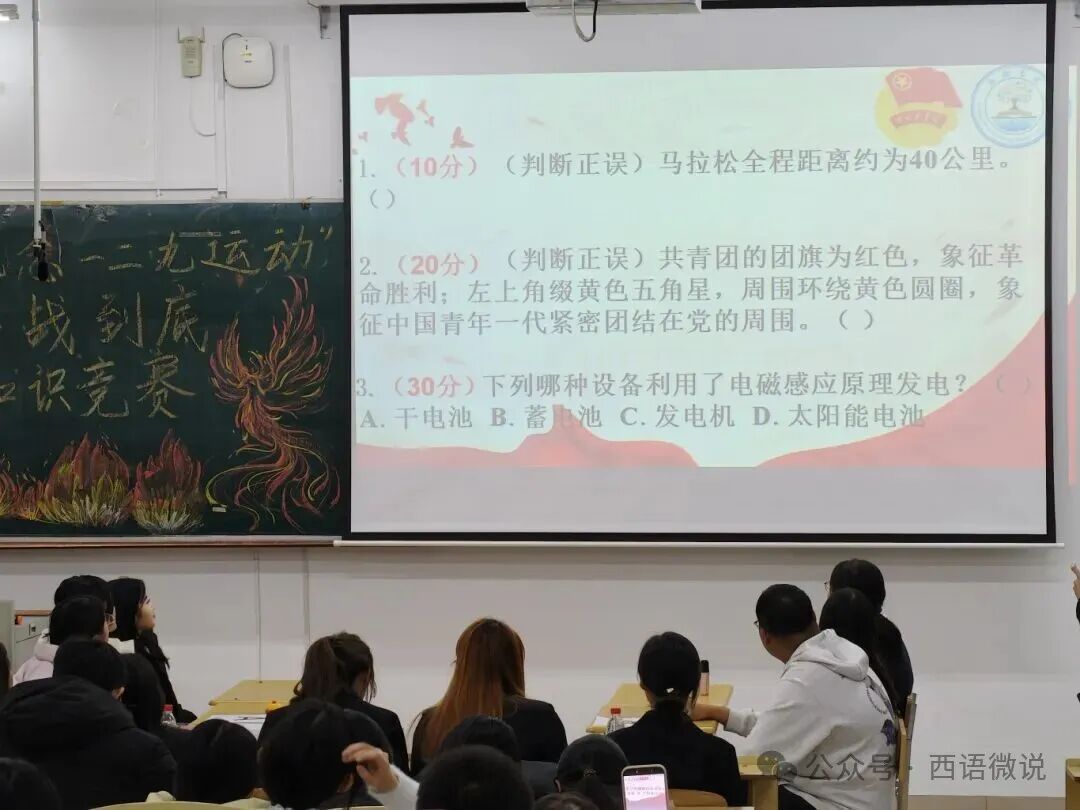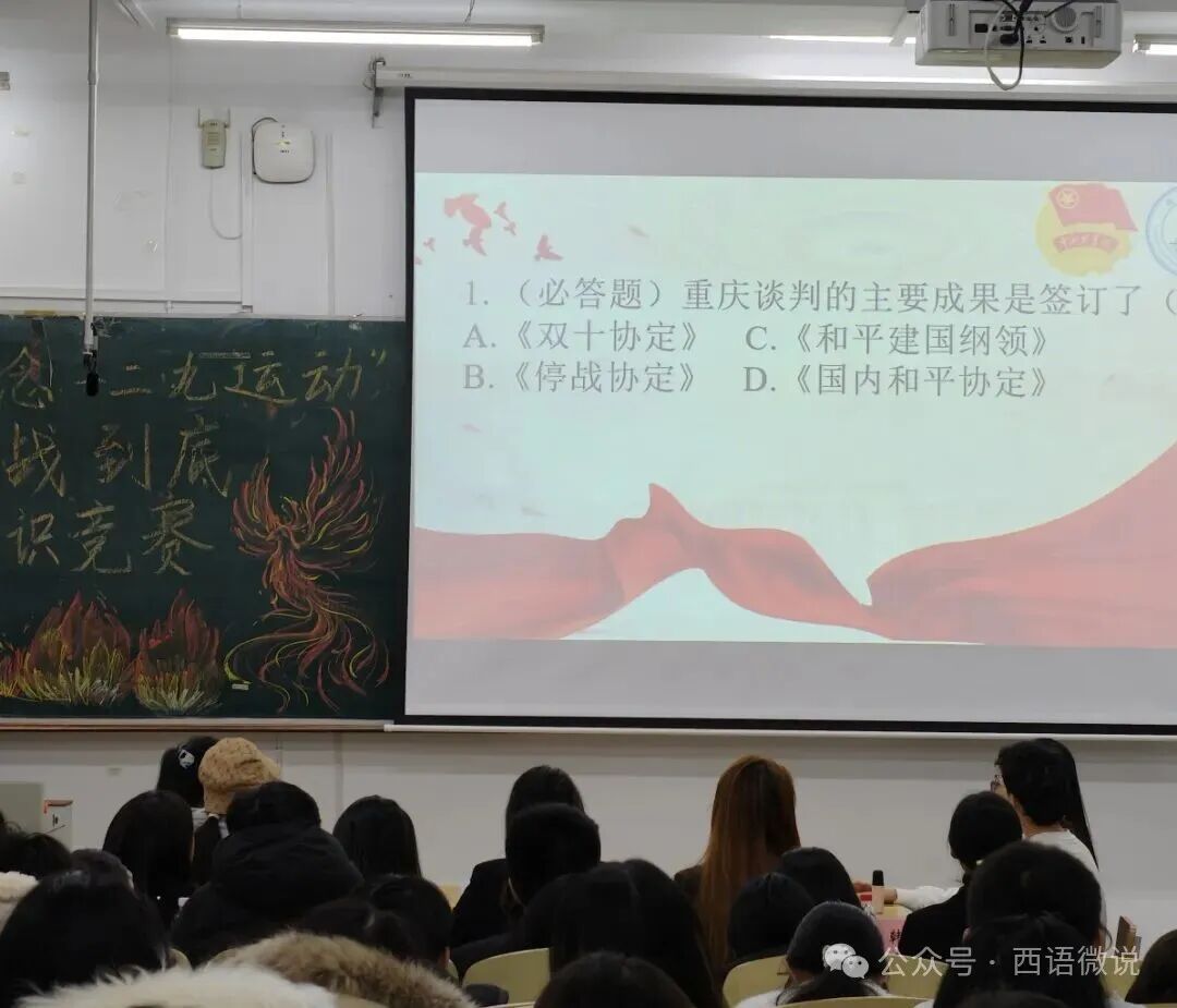 为纪念“一二·九”爱国运动,激发青年爱国热情,西语学院团委于2025年12月开展“一二·九”爱国运动知识竞赛。西语学院团委书记徐伟伟,校学生会主席团成员李思潼,校行知青年新媒体中心副主任项奎智,经济与管理学院团委学生兼职副书记李柯敏,东语学院团委学生兼职副书记韩溪娅,西语学院团委学生兼职副书记计美佳,曹妍妍,苏鑫蕊担任本次比赛评委。