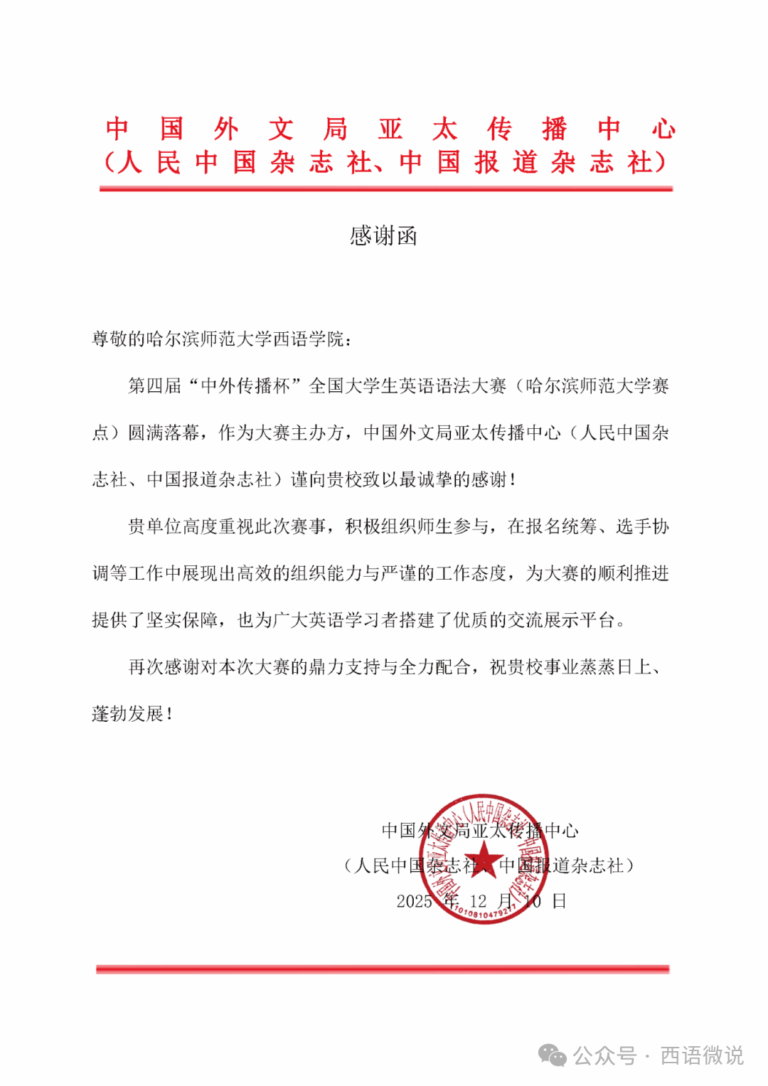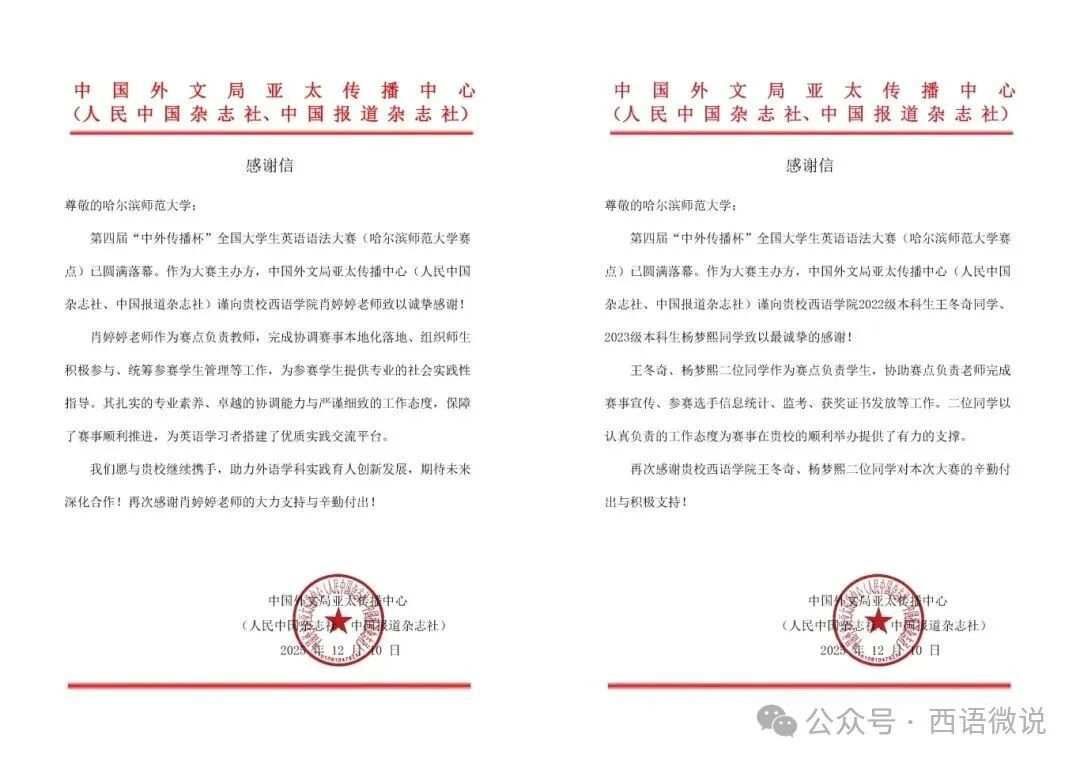 本次赛事佳绩的取得,离不开主办单位和学院的支持、指导教师的专业引领,以及学生骨干的协助。在学院的支持下,西语学院英语语法第二课堂为参赛学生搭建系统化备赛平台。学院因积极组织赛事、提供优质保障,收到主办单位颁发的感谢函。