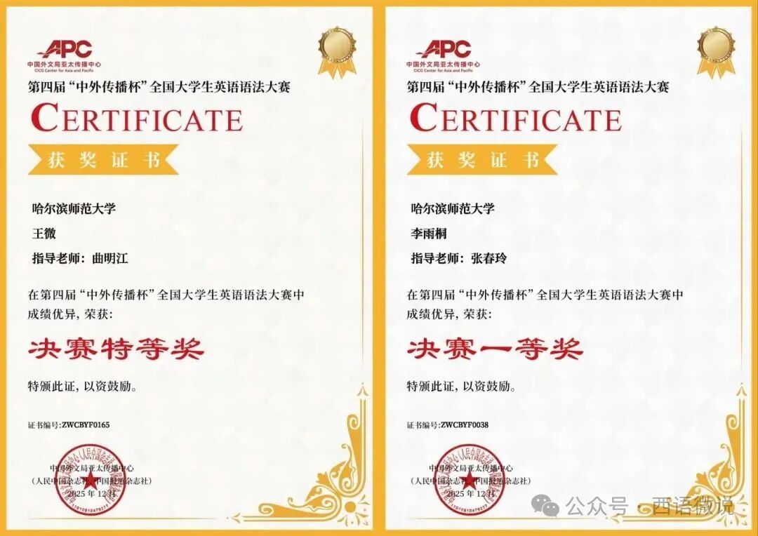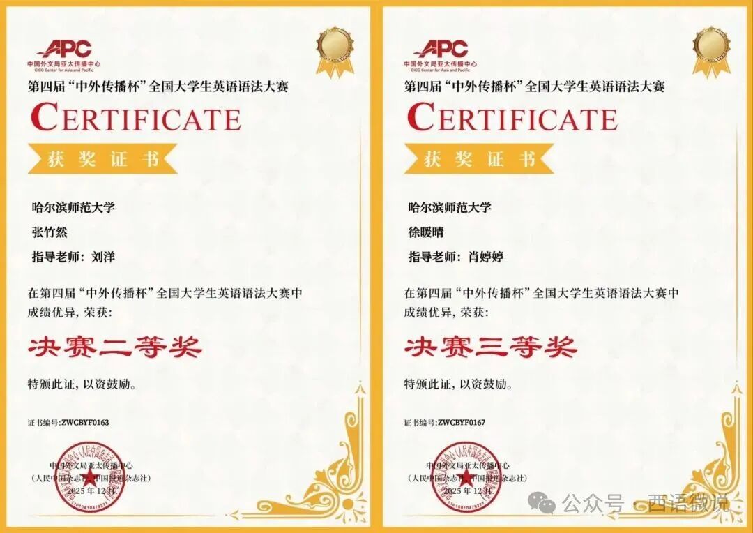 近日,由中国外文局亚太传播中心(人民中国杂志社、中国报道杂志社)主办的第四届“中外传播杯”全国大学生英语语法大赛落下帷幕。我院学子凭借扎实的语法功底与出色的临场发挥脱颖而出,尽显西语学子的外语素养与竞技风采。