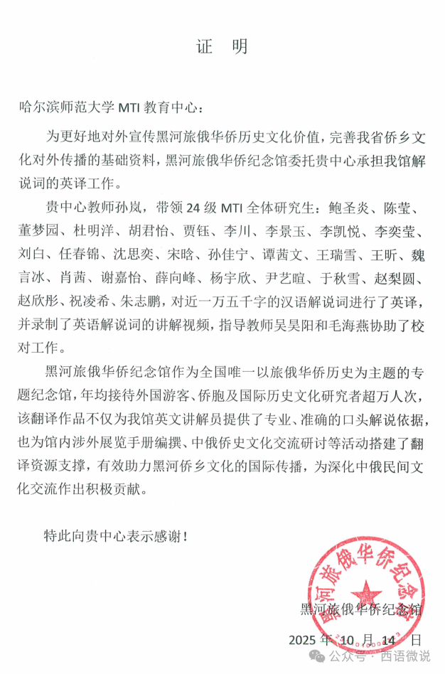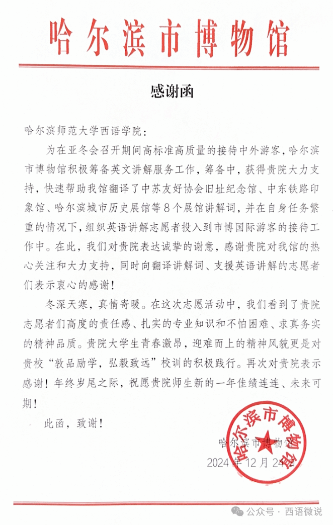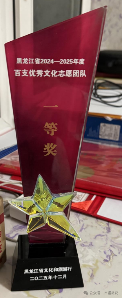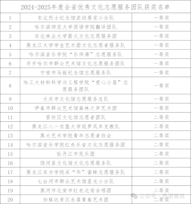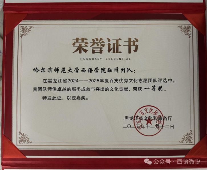 在黑龙江省文化和旅游厅举办的“黑龙江省2024-2025年度百支优秀文化志愿服务团队”评选中,哈尔滨师范大学西语学院翻译团队凭借卓越的服务成效与突出的文化贡献,荣获一等奖,成为全省获此殊荣的10支团队之一。