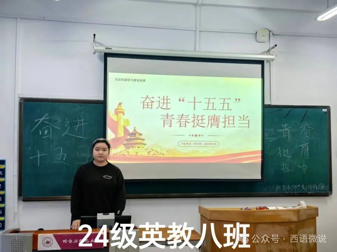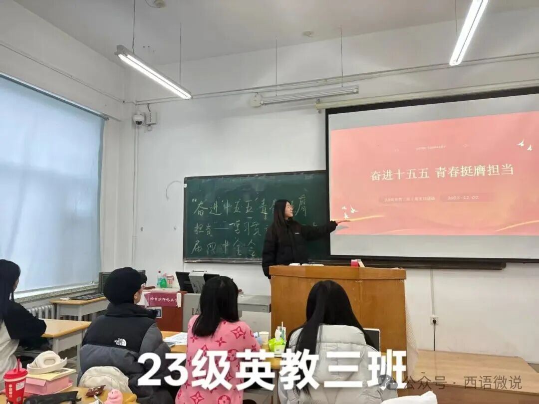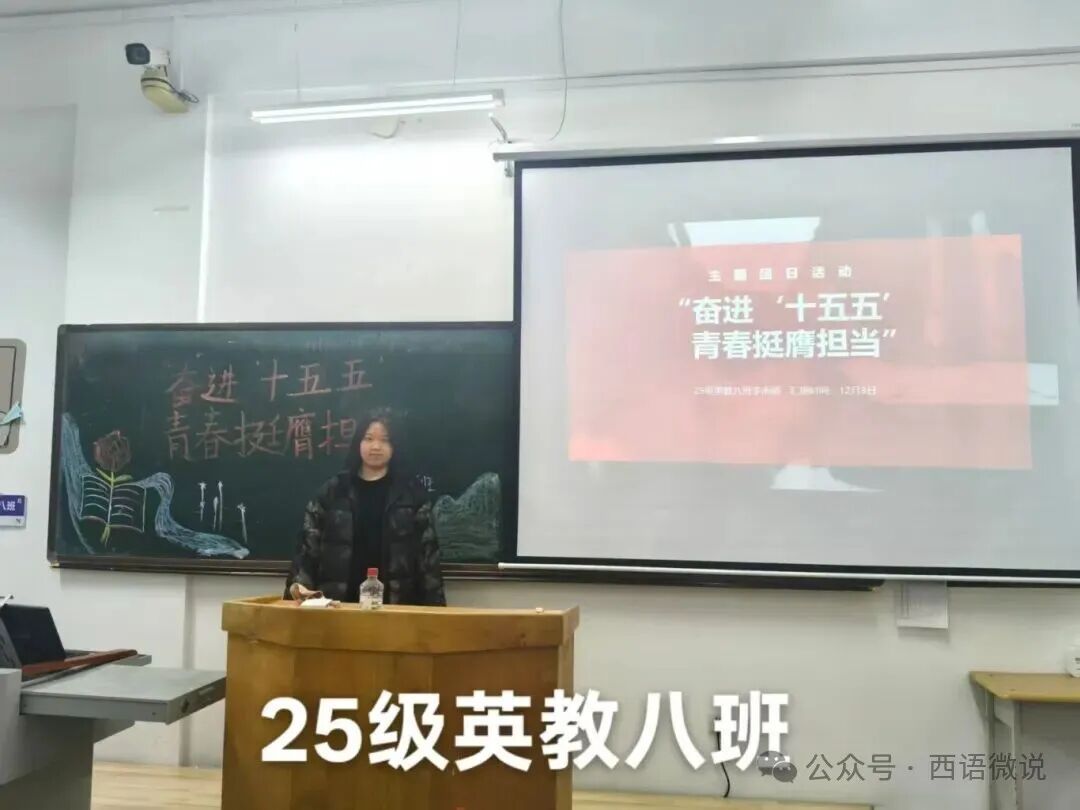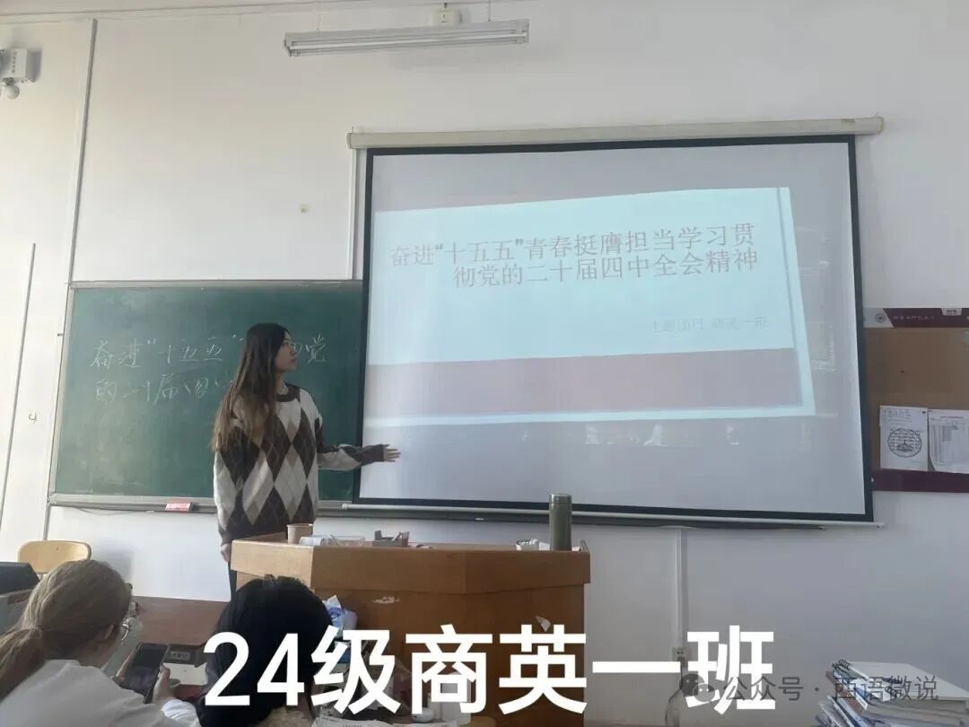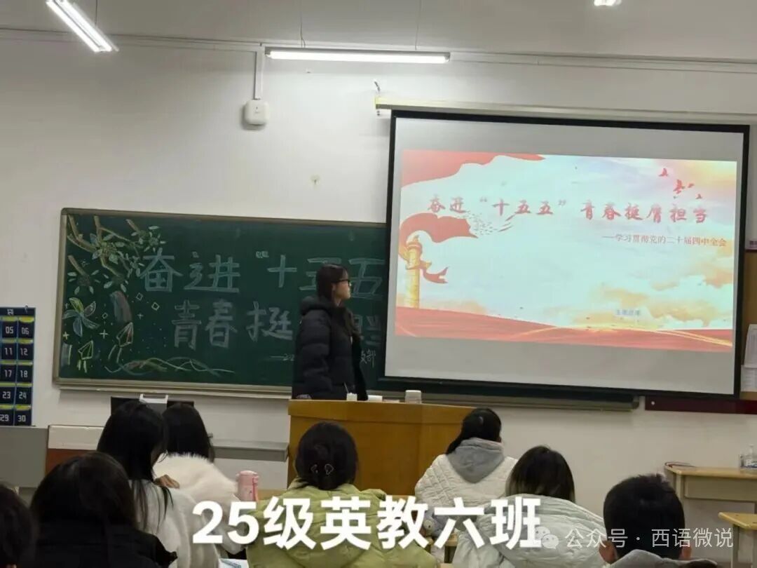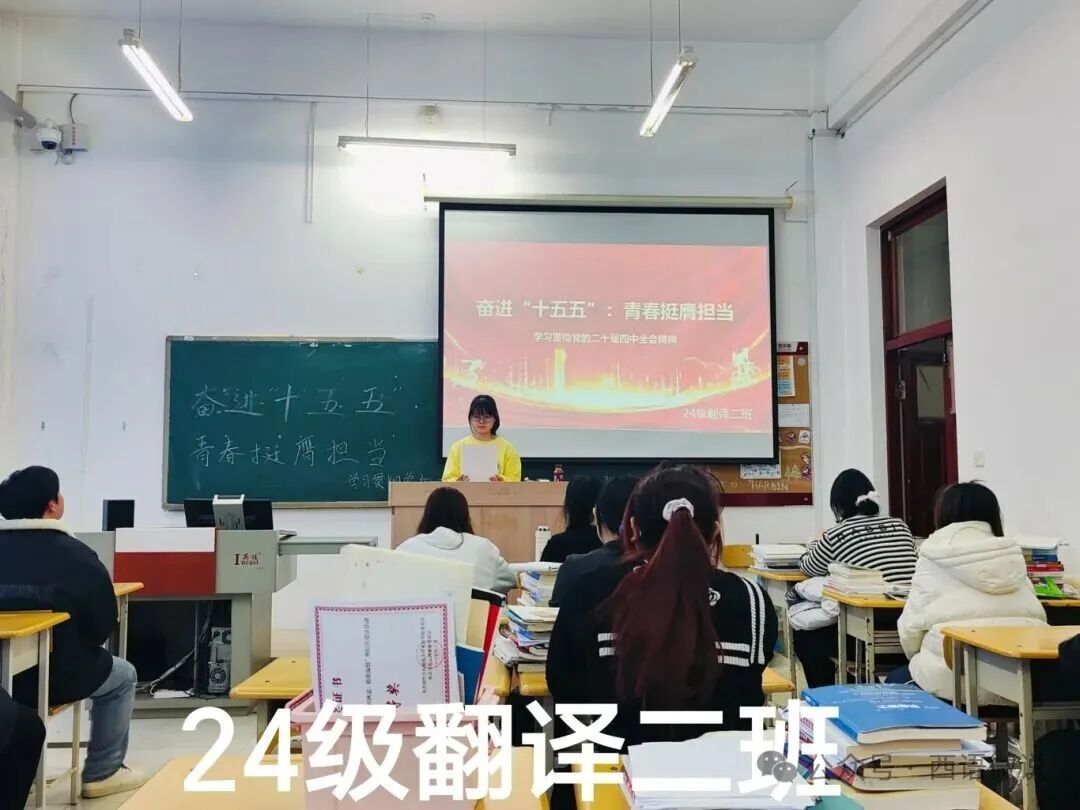 各团支部聚焦二十届四中全会核心要点,团员们通过政策要点双语解读、“专业赋能国家战略”,深化对“十五五”战略定位的理解,明确以语言为桥、对接国家需求的成长方向,在互动中凝聚青春建功的奋进力量。