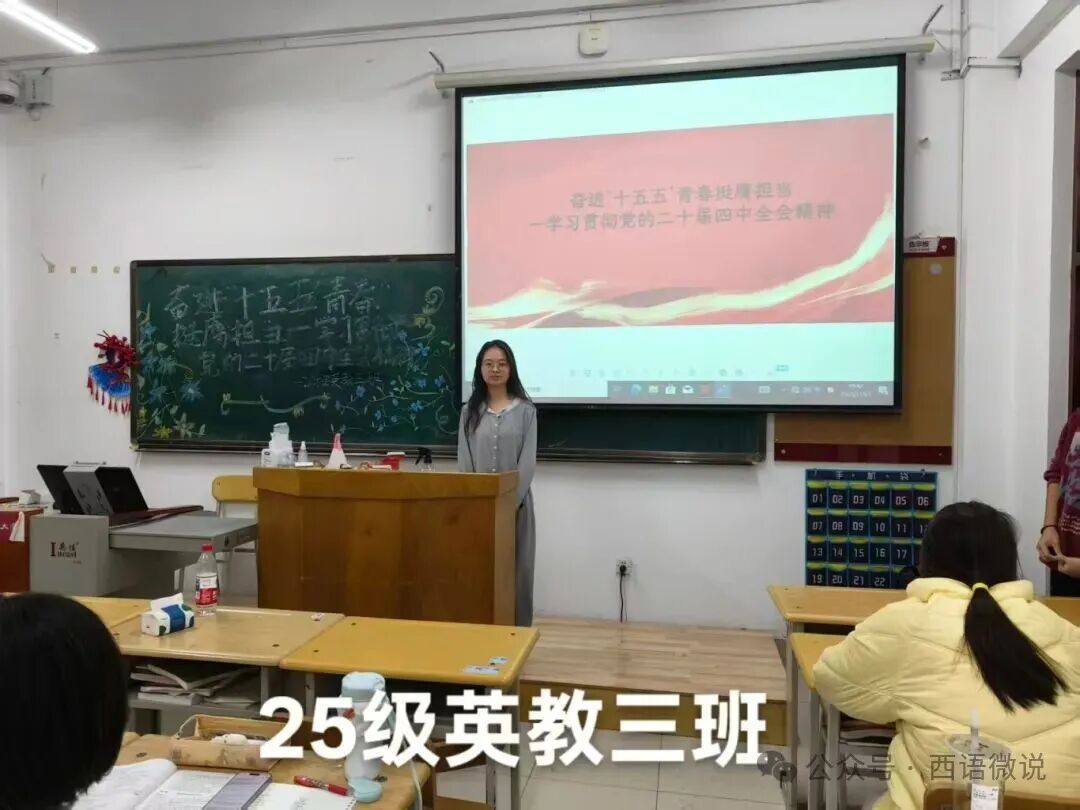 各团支部聚焦二十届四中全会中“对外开放深化”“文化自信自强”等核心要点,结合西语专业特色,拆解语言在搭建沟通桥梁、讲好中国故事、助力经贸合作中的跨文化传播战略价值。