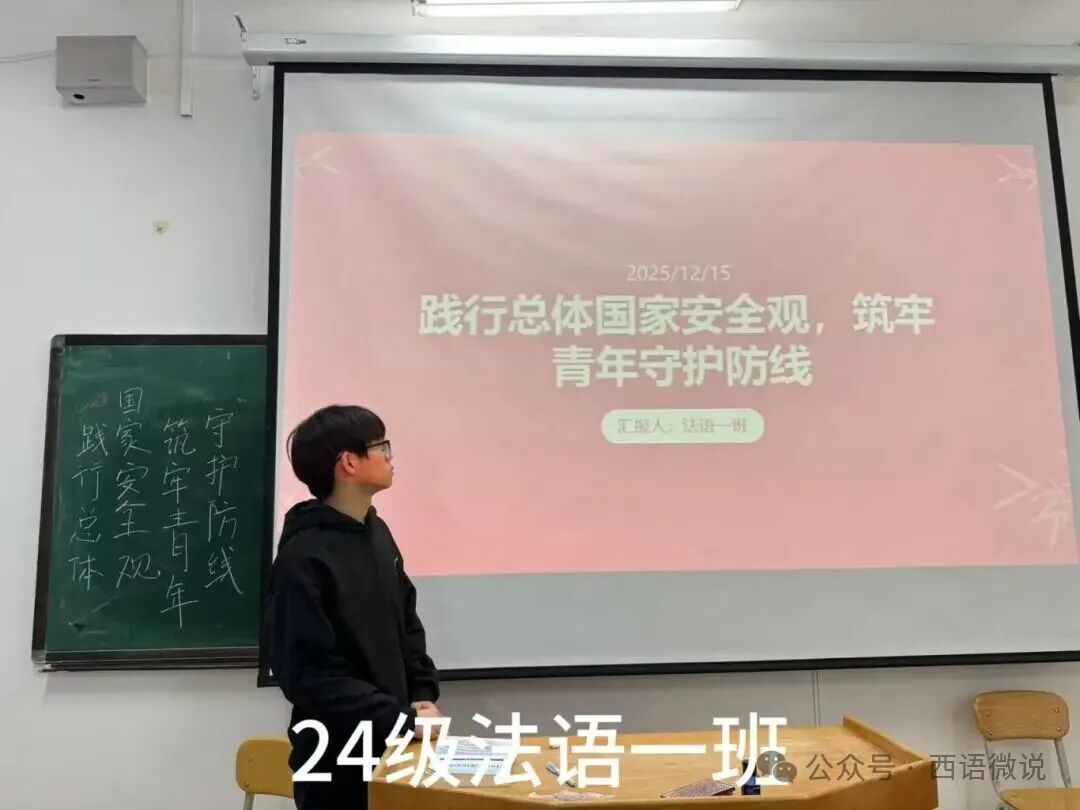 此次活动不仅让国家安全意识如种子般深植青年心田,更将“国之大者”的使命担当融入青春血脉。西语学子在理论学习与实践分享中明晰责任坐标,于思想共鸣中凝聚奋进力量,以青春之我筑牢国家安全的坚固防线,用行动诠释“强国有我”的铮铮誓言,为护航强国建设、助力民族复兴注入源源不断的青春动能,让守护家国的赤诚之心在时代征程中熠熠生辉。
