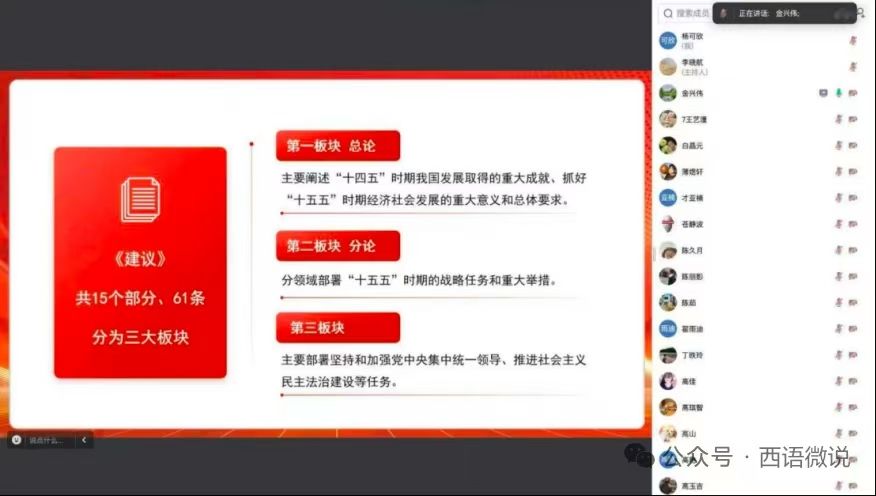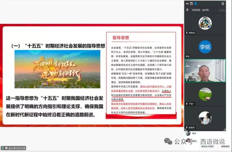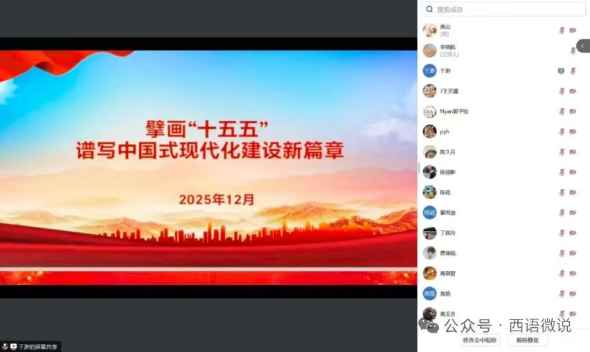 为深入学习贯彻党的二十届四中全会精神,全面准确把握全会重大意义、丰富内涵和实践要求,12月26日上午,西语学院举办学习贯彻党的二十届四中全会精神线上专题宣讲报告会,我校党的二十届四中全会精神宣讲团成员、马克思主义学院副教授金兴伟作《擘画“十五五”谱写中国式现代化建设新篇章》的专题宣讲,师生党员代表参加宣讲活动,学院党委书记李晓航主持会议。
