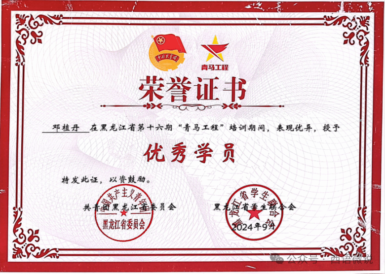 邓植丹政治立场坚定,大力弘扬“奉献、友爱、互助、进步”的志愿精神,具有较强的社会责任意识。参加黑龙江省第十六期青马工程培训及哈尔滨师范大学第十三期青马工程培训,并获优秀学员荣誉称号。邓植丹始终将“对党忠诚”作为人生信条,将理论学习成果转化为志愿服务的生动实践,让“奉献、友爱、互助、进步”的志愿精神在校园生根发芽,是一名合格的新时代青年马克思主义者。