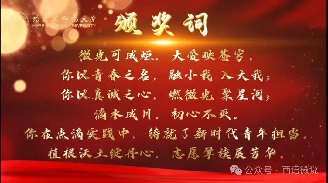 获评“感动校园十佳大学生”,我深感荣幸与责任。这份荣誉,是老师们、同行者们用支持编织的勋章,它属于西语学院这片助我成长的沃土,属于哈尔滨师范大学“知行合一”精神的深沉滋养,更属于每一颗在哈师大默默燃烧、传递温暖的志愿星火。