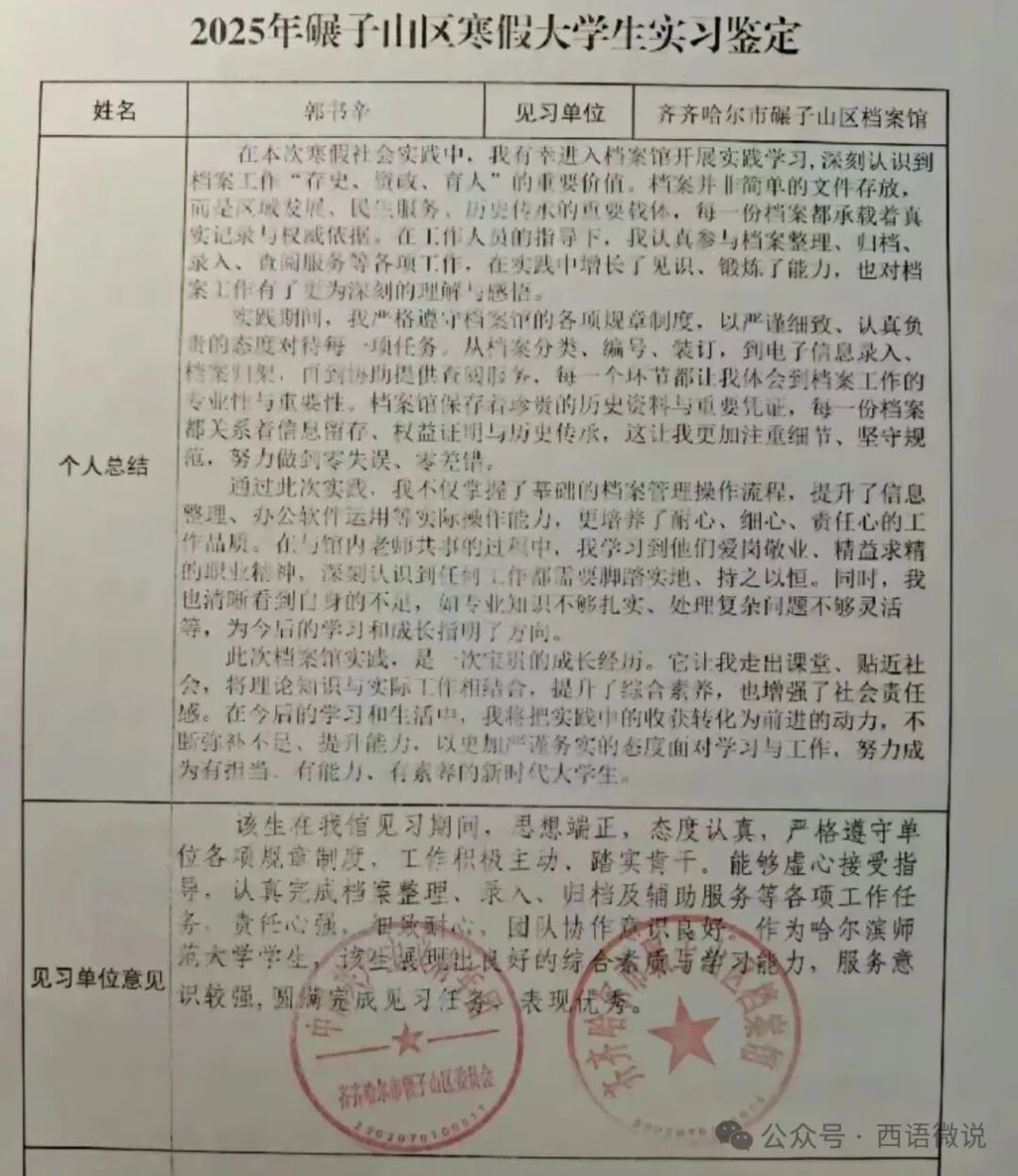 2026年1月19日至2026年2月27日,2025级英语师范专业6班郭书辛赴齐齐哈尔市碾子山区档案馆,并参与金长城历史博物馆相关工作。实习期间,她以严谨的态度完成档案整理、归档、录入等各项任务,确保每一份档案资料准确无误、规范入藏。在实践中,她不仅练就了扎实的业务功底,培养了细致入微的工作作风,更深刻体悟到档案工作“存史、资政、育人”的使命内涵,以实际行动践行新时代青年的文化传播使命与担当。
