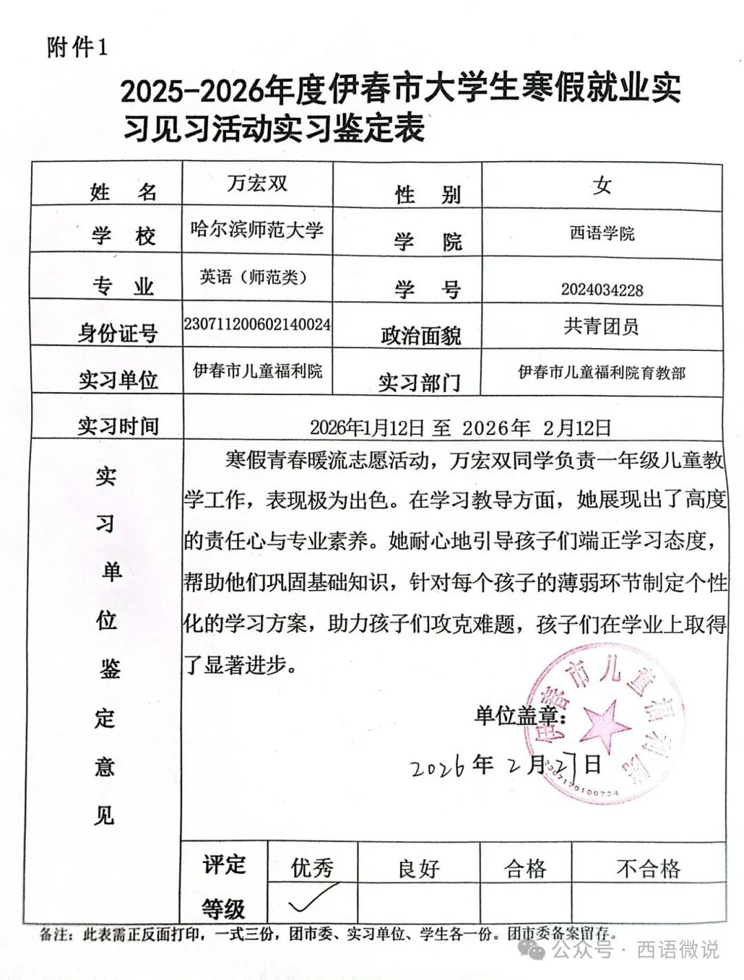 2026年1月,2024级英语师范专业1班万宏双前往伊春市儿童福利院,开展“返家乡做贡献”社会实践活动。作为一对一的学业辅导志愿者,她耐心为孩子们讲解知识点、批改作业,陪伴他们完成手工作品,在日常相处中传递温暖与关爱。此次实践让她跳出课本局限,深切体会到“爱心”“耐心”与“责任心”的分量,也对“教育”与“责任”有了更加深刻的理解。这段经历让她更加坚定了投身教育事业的信念——用知识点亮希望,用陪伴守护成长,让青春在奉献中绽放最温暖的光彩。