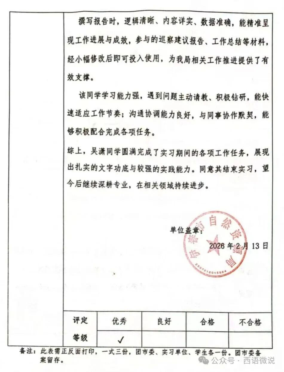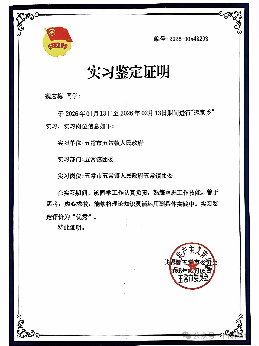 2026年1月5日至2月6日,2025级英语师范专业9班魏宏梅来到五常镇人民政府党政综合办公室,投身基层政务实践。实习期间,她从档案整理、政务数据录入、工作简报草拟等基础工作做起,认真学习公文写作规范,在点滴积累中锤炼综合业务能力。同时,她耐心协助前来办事的群众,热情解答疑问,以细致服务传递基层温度,用踏实作风展现青春风采,在平凡岗位上书写了属于自己的实践答卷。