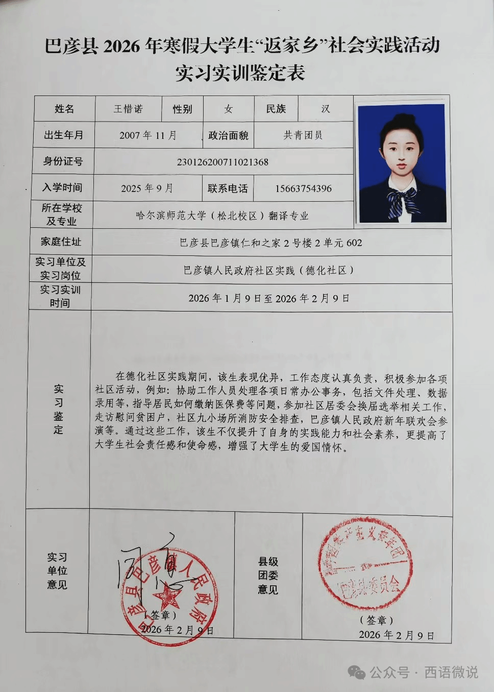 2026年1月9日至2026年2月9日,2025级翻译2班王惜诺担任巴彦县巴彦镇政务实践负责人,牵头组织返乡青年参与基层治理实践活动。任职期间,她精准分配实践岗位,统筹推进各环节工作,从人员调度到任务落实都安排得井井有条,确保实践活动有序高效开展。面对基层事务的繁杂琐碎,她耐心沟通协调,及时解决实践中遇到的问题,在服务群众的第一线既积累了宝贵的基层工作经验,也锻炼了统筹能力与执行能力,更在点滴服务中厚植了家国情怀与责任担当