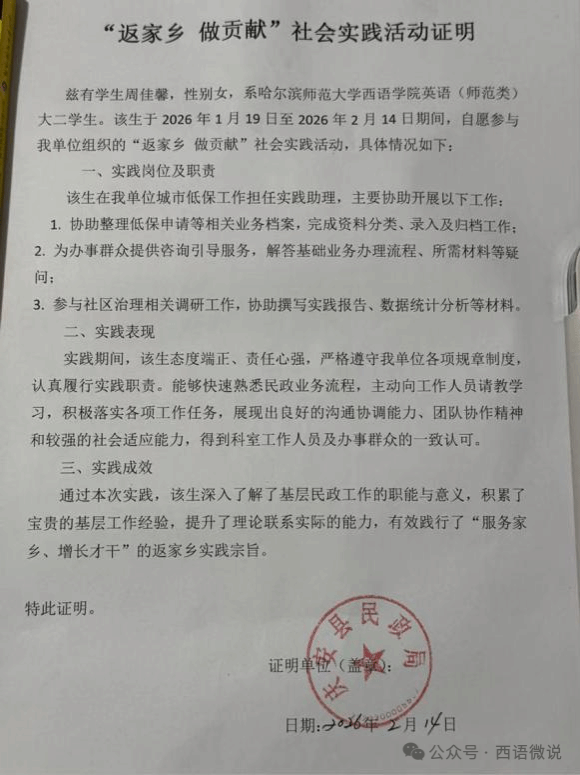 2026年1月19日至2月14日,2024级英语师范专业4班周佳馨来到庆安县民政局,担任低保工作实践助理。在实践过程中,她认真整理低保业务档案,为办事群众提供贴心咨询引导,并主动参与社区治理调研工作,以踏实作风和良好表现赢得工作人员与群众的一致认可,用实际行动为基层治理贡献青春力量,诠释了民政服务的温暖初心。