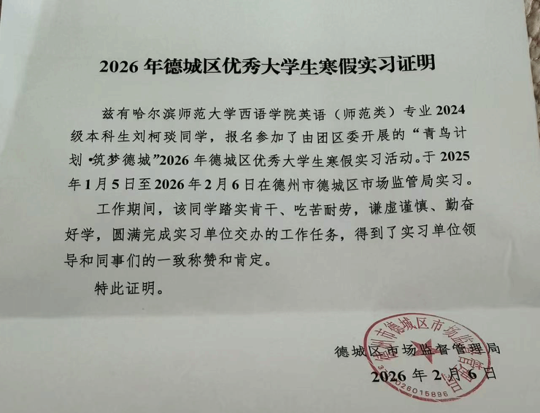 2026年1月5日至2026年2月6日,2024级英语师范专业7班刘柯琰赴德州市德城区市场监督管理局开展基层实践。作为辅助岗实习生,她细致核查辖区经营主体信息,规范整理监管台账与检查资料,在实操中熟练掌握基础业务流程,深刻体会到基层监管对维护市场秩序、保障民生安全的重要意义,以青春行动筑牢市场监管防线。