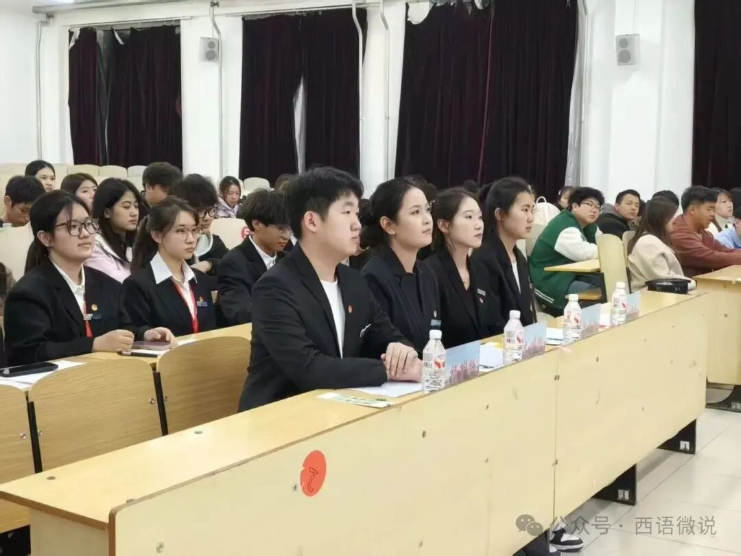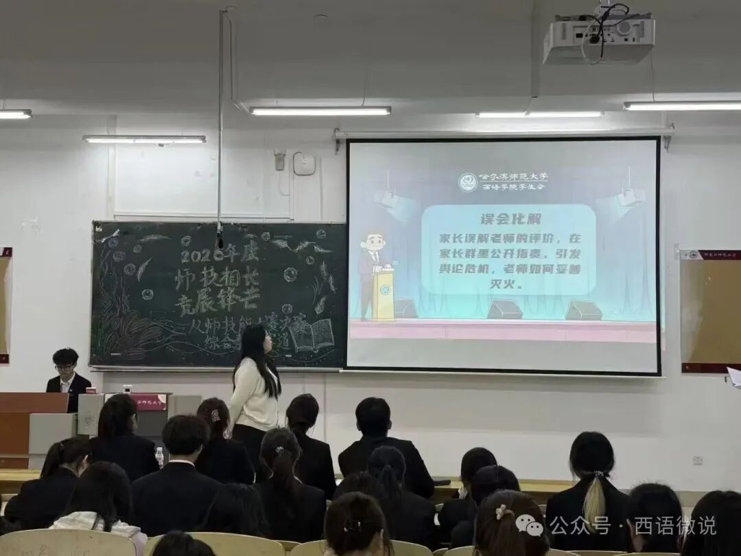 本次活动面向我院2023级、2024级、2025级全体学生开展,大赛初赛采用线下闭卷形式进行,最终,共有30名选手成功晋级决赛,其中16名同学自主选择参与综合素养赛道;本次决赛于3月24日19:00在西语楼451 551教室进行,在主持人铿锵有力的开场后,大赛正式拉开帷幕。参赛选手按照前期抽签顺序,在现场工作人员的有序组织下依次登台展示。选手们围绕社会热点讨论话题进行中文演讲,展现了选手们独具特色的观点。经过激烈的角逐,共八名选手脱颖而出,站在了半决赛的舞台上,他们当场抽取家校沟通模拟题目,进行现场作答,作答完毕后主持人揭晓最终结果。