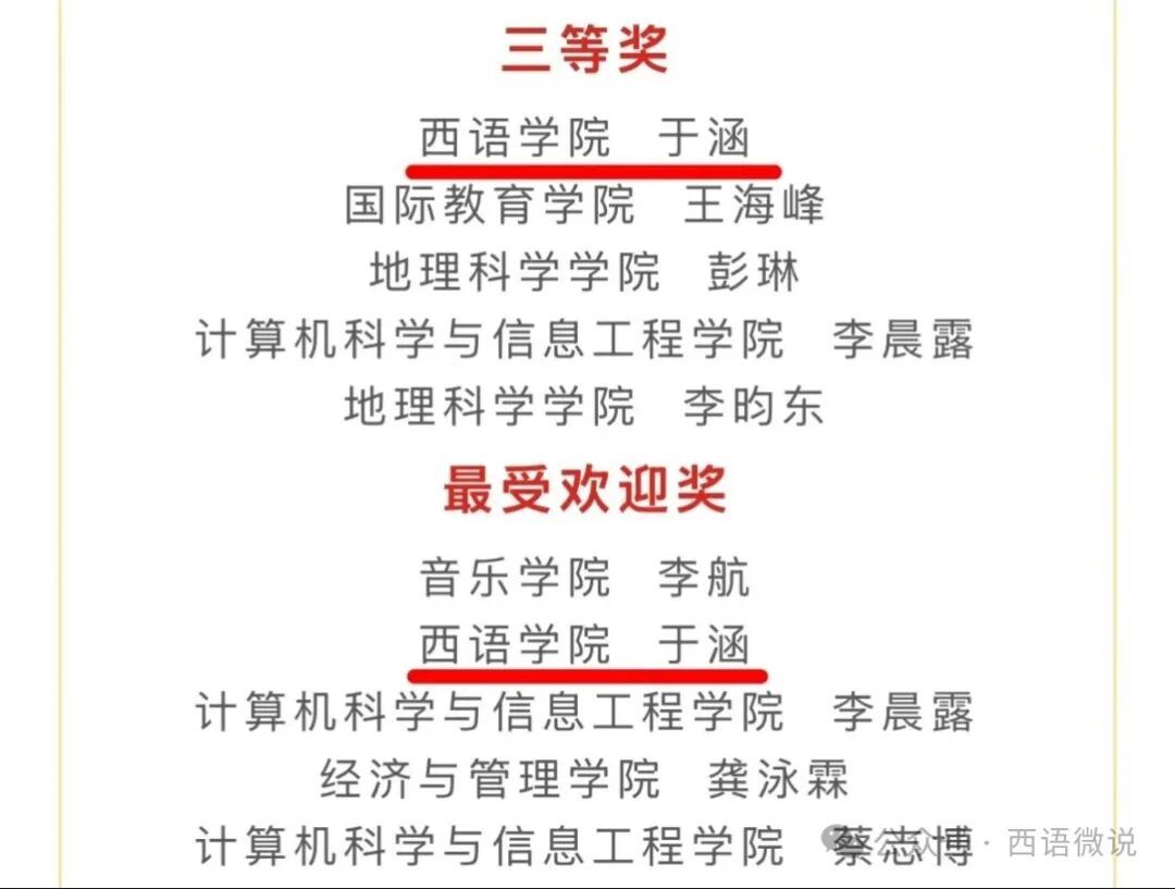 此次获奖既是对于涵个人的专业能力与工作实绩的充分肯定,也彰显了西语学院在辅导员队伍建设、学工队伍专业能力培养方面的扎实成效。西语学院始终聚焦辅导员队伍专业化、内涵式发展,着力打造全员协同、全程渗透、全域覆盖的育人体系。西语学院将持续强化队伍建设,激励全体育人工作者深耕实践、精进本领、守正创新,以更高标准推动学生工作提质增效,为学校育人事业高质量发展贡献力量。