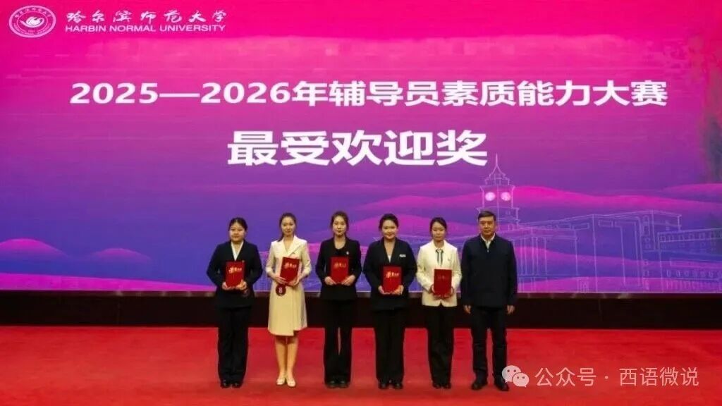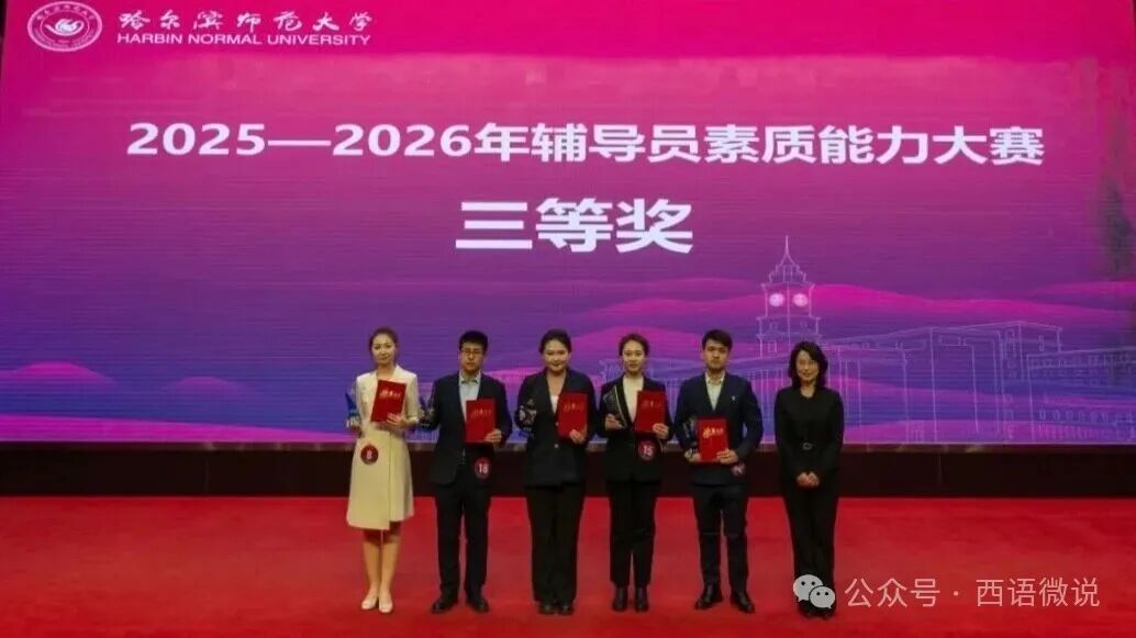 为深入贯彻落实全国、全省教育大会精神,全面落实新时代立德树人工程,聚焦“第四支队伍”建设,不断提升辅导员队伍的理论水平、职业能力和专业素养,着力构建全员全过程全方位全领域育人新格局。哈尔滨师范大学2025-2026年度辅导员素质能力大赛决赛暨颁奖仪式于3月25日在科学会堂举行,西语学院辅导员于涵荣获大赛三等奖及最受欢迎奖。
