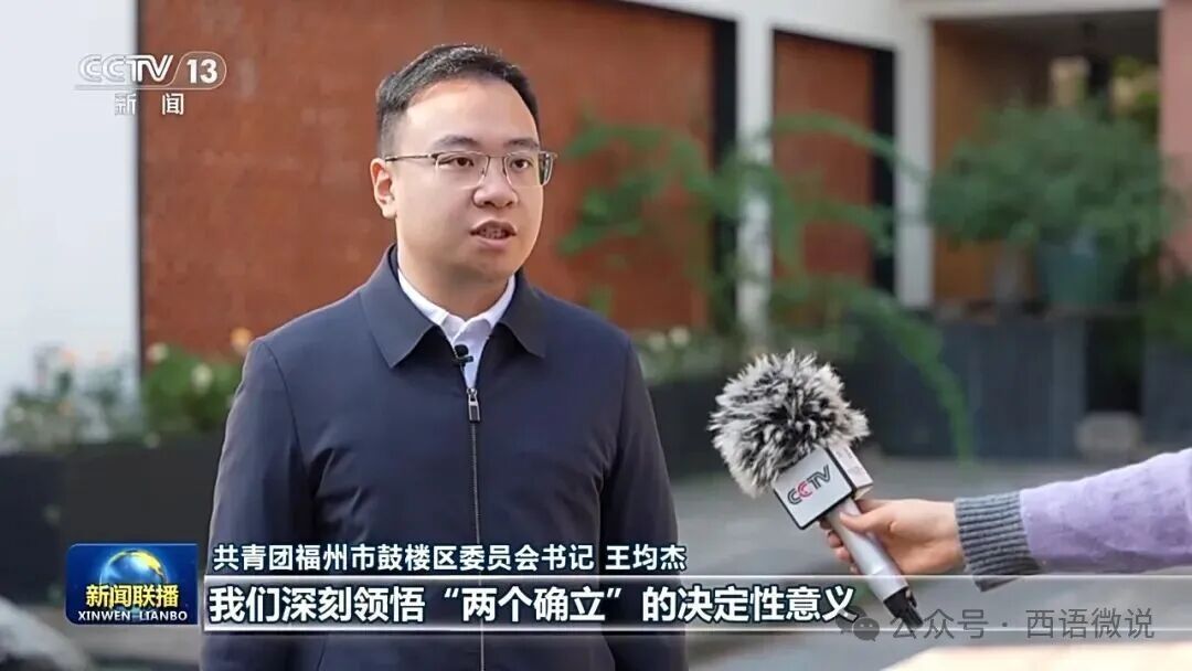 共青团福州市鼓楼区委员会书记王均杰:我们深刻领悟“两个确立”的决定性意义,坚决做到“两个维护”,以自身的坚定信念和实际行动,引导广大青年把个人理想融入到中国式现代化建设的伟大事业中,让青春在奋斗中绽放光彩。